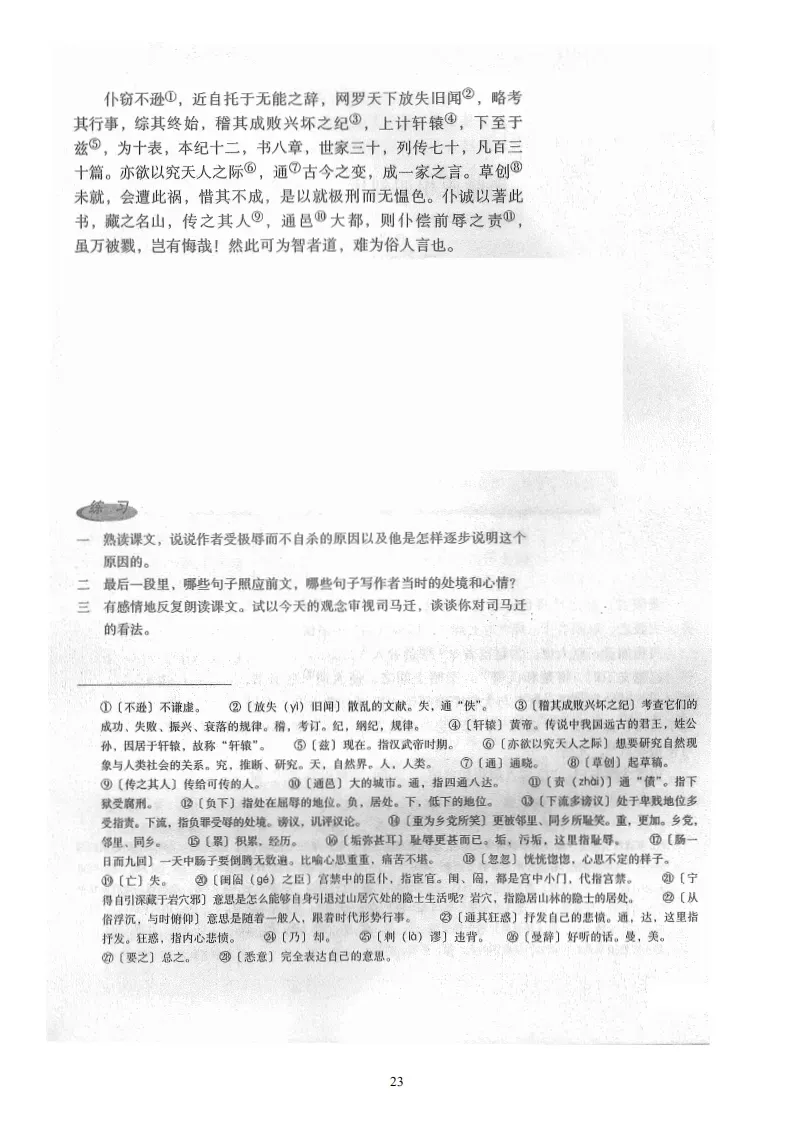 古者富贵而名摩灭,不可胜记,唯倜傥非常之人称焉。盖文王拘而演《周易》;仲尼厄而作《春秋》;屈原放逐,乃赋《离骚》;左丘失明,厥有《国语》;孙子膑脚,《兵法》修列;不韦迁蜀,世传《吕览》;韩非囚秦,《说难》《孤愤》;《诗》三百篇,大抵圣贤发愤之所为作也。此人皆意有所郁结,不得通其道,故述往事、思来者。乃如左丘无目,孙子断足,终不可用,退而论书策,以舒其愤,思垂空文以自见。仆窃不逊,近自托于无能之辞,网罗天下放失旧闻,略考其行事,综其终始,稽其成败兴坏之纪,上计轩辕,下至于兹,为十表,本纪十二,书八章,世家三十,列传七十,凡百三十篇。亦欲以究天人之际,通古今之变,成一家之言。草创未就,会遭此祸,惜其不成,是以就极刑而无愠色。仆诚以著此书,藏之名山,传之其人,通邑大都,则仆偿前辱之责,虽万被戮,岂有悔哉!然此可为智者道,难为俗人言也!
