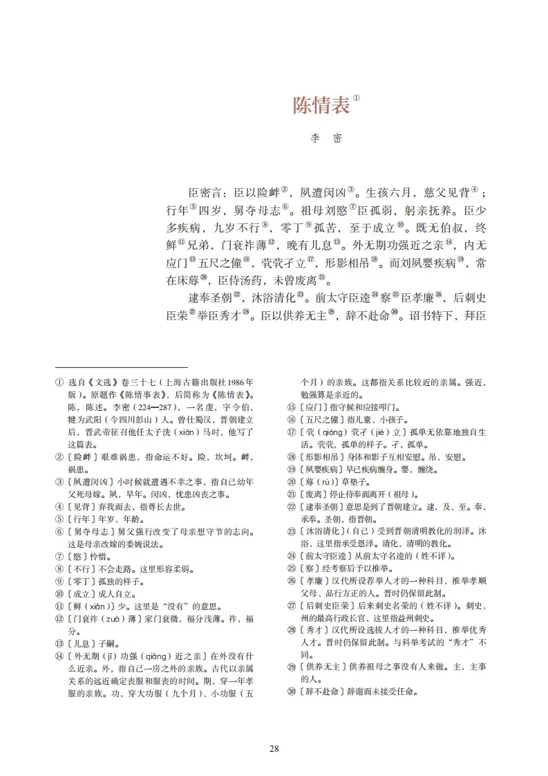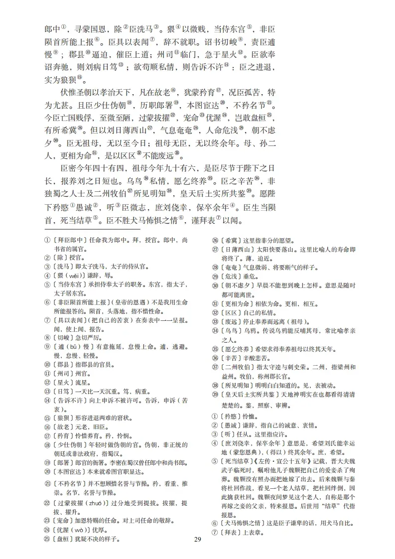 臣密言:臣以险衅,夙遭闵凶。生孩六月,慈父见背;行年四岁,舅夺母志。祖母刘悯臣孤弱,躬亲抚养。臣少多疾病,九岁不行,零丁孤苦,至于成立。既无叔伯,终鲜兄弟,门衰祚薄,晚有儿息。外无期功强近之亲,内无应门五尺之僮,茕茕孑立,形影相吊。而刘夙婴疾病,常在床蓐,臣侍汤药,未曾废离。逮奉圣朝,沐浴清化。前太守臣逵察臣孝廉,后刺史臣荣举臣秀才。臣以供养无主,辞不赴命。诏书特下,拜臣郎中,寻蒙国恩,除臣洗马。猥以微贱,当侍东宫,非臣陨首所能上报。臣具以表闻,辞不就职。诏书切峻,责臣逋慢。郡县逼迫,催臣上道;州司临门,急于星火。臣欲奉诏奔驰,则刘病日笃;欲苟顺私情,则告诉不许:臣之进退,实为狼狈。伏惟圣朝以孝治天下,凡在故老,犹蒙矜育,况臣孤苦,特为尤甚。且臣少仕伪朝,历职郎署,本图宦达,不矜名节。今臣亡国贱俘,至微至陋,过蒙拔擢,宠命优渥,岂敢盘桓,有所希冀。但以刘日薄西山,气息奄奄,人命危浅,朝不虑夕。臣无祖母,无以至今日;祖母无臣,无以终余年。母、孙二人,更相为命,是以区区不能废远。臣密今年四十有四,祖母刘今年九十有六,是臣尽节于陛下之日长,报养刘之日短也。乌鸟私情,愿乞终养。臣之辛苦,非独蜀之人士及二州牧伯所见明知,皇天后土,实所共鉴。愿陛下矜悯愚诚,听臣微志,庶刘侥幸,保卒余年。臣生当陨首,死当结草。臣不胜犬马怖惧之情,谨拜表以闻。