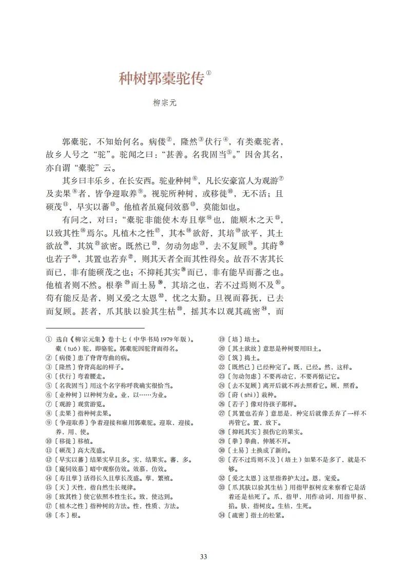郭橐驼,不知始何名。病偻,隆然伏行,有类橐驼者,故乡人号之“驼”。驼闻之,曰:“甚善。名我固当。”因舍其名,亦自谓橐驼云。其乡曰丰乐乡,在长安西。驼业种树,凡长安豪富人为观游及卖果者,皆争迎取养。视驼所种树,或移徙,无不活,且硕茂,早实以蕃。他植者虽窥伺效慕,莫能如也。有问之,对曰:“橐驼非能使木寿且孳也,能顺木之天,以致其性焉尔。凡植木之性,其本欲舒,其培欲平,其土欲故,其筑欲密。既然已,勿动勿虑,去不复顾。其莳也若子,其置也若弃,则其天者全而其性得矣。故吾不害其长而已,非有能硕茂之也;不抑耗其实而已,非有能早而蕃之也。他植者则不然,根拳而土易,其培之也,若不过焉则不及。苟有能反是者,则又爱之太恩,忧之太勤,旦视而暮抚,已去而复顾,甚者爪其肤以验其生枯,摇其本以观其疏密,而木之性日以离矣。虽曰爱之,其实害之;虽曰忧之,其实仇之,故不我若也。吾又何能为哉!”问者曰:“以子之道,移之官理,可乎?”驼曰:“我知种树而已,官理,非吾业也。然吾居乡,见长人者好烦其令,若甚怜焉,而卒以祸。旦暮吏来而呼曰:‘官命促尔耕,勖尔植,督尔获,早缫而绪,早织而缕,字而幼孩,遂而鸡豚。’鸣鼓而聚之,击木而召之。吾小人辍飧饔以劳吏者,且不得暇,又何以蕃吾生而安吾性耶?故病且怠。若是,则与吾业者其亦有类乎?”问者曰:“嘻,不亦善夫!吾问养树,得养人术。”传其事以为官戒。