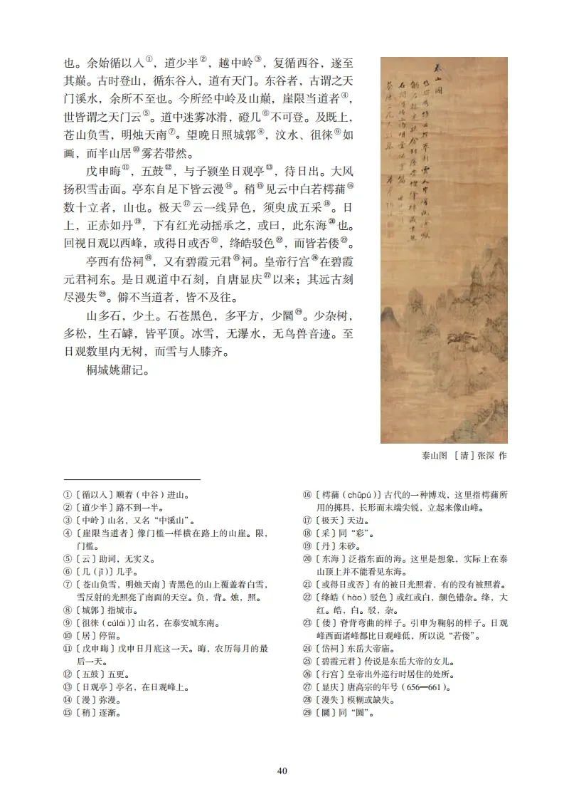 泰山之阳,汶水西流;其阴,济水东流。阳谷皆入汶,阴谷皆入济。当其南北分者,古长城也。最高日观峰,在长城南十五里。余以乾隆三十九年十二月,自京师乘风雪,历齐河、长清,穿泰山西北谷,越长城之限,至于泰安。是月丁未,与知府朱孝纯子颍由南麓登。四十五里,道皆砌石为磴,其级七千有余。泰山正南面有三谷。中谷绕泰安城下,郦道元所谓环水也。余始循以入,道少半,越中岭,复循西谷,遂至其巅。古时登山,循东谷入,道有天门。东谷者,古谓之天门溪水,余所不至也。今所经中岭及山巅崖限当道者,世皆谓之天门云。道中迷雾冰滑,磴几不可登。及既上,苍山负雪,明烛天南;望晚日照城郭,汶水、徂徕如画,而半山居雾若带然。戊申晦,五鼓,与子颖坐日观亭,待日出。大风扬积雪击面。亭东自足下皆云漫。稍见云中白若摴蒱数十立者,山也。极天云一线异色,须臾成五彩。日上,正赤如丹,下有红光,动摇承之。或曰,此东海也。回视日观以西峰,或得日,或否,绛皓驳色,而皆若偻。亭西有岱祠,又有碧霞元君祠;皇帝行宫在碧霞元君祠东。是日,观道中石刻,自唐显庆以来,其远古刻尽漫失。僻不当道者,皆不及往。山多石,少土;石苍黑色,多平方,少圜。少杂树,多松,生石罅,皆平顶。冰雪,无瀑水,无鸟兽音迹。至日观数里内无树,而雪与人膝齐。桐城姚鼐记。