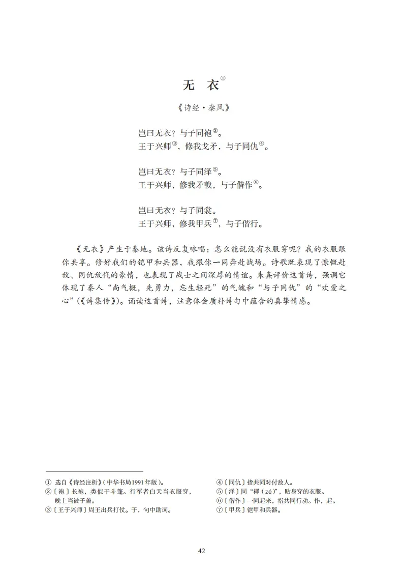 2、《无衣》(《诗经》)岂曰无衣?与子同袍。王于兴师,修我戈矛。与子同仇!岂曰无衣?与子同泽。王于兴师,修我矛戟。与子偕作!岂曰无衣?与子同裳。王于兴师,修我甲兵。与子偕行!