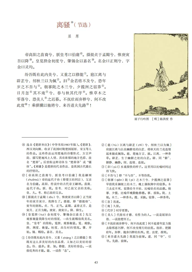 3、《离骚》(屈原)帝高阳之苗裔兮,朕皇考曰伯庸。摄提贞于孟陬兮,惟庚寅吾以降。皇览揆余初度兮,肇锡余以嘉名。名余曰正则兮,字余曰灵均。纷吾既有此内美兮,又重之以修能。扈江离与辟芷兮,纫秋兰以为佩。汨余若将不及兮,恐年岁之不吾与。朝搴阰之木兰兮,夕揽洲之宿莽。日月忽其不淹兮,春与秋其代序。唯草木之零落兮,恐美人之迟暮。不抚壮而弃秽兮,何不改乎此度?乘骐骥以驰骋兮,来吾道夫先路!