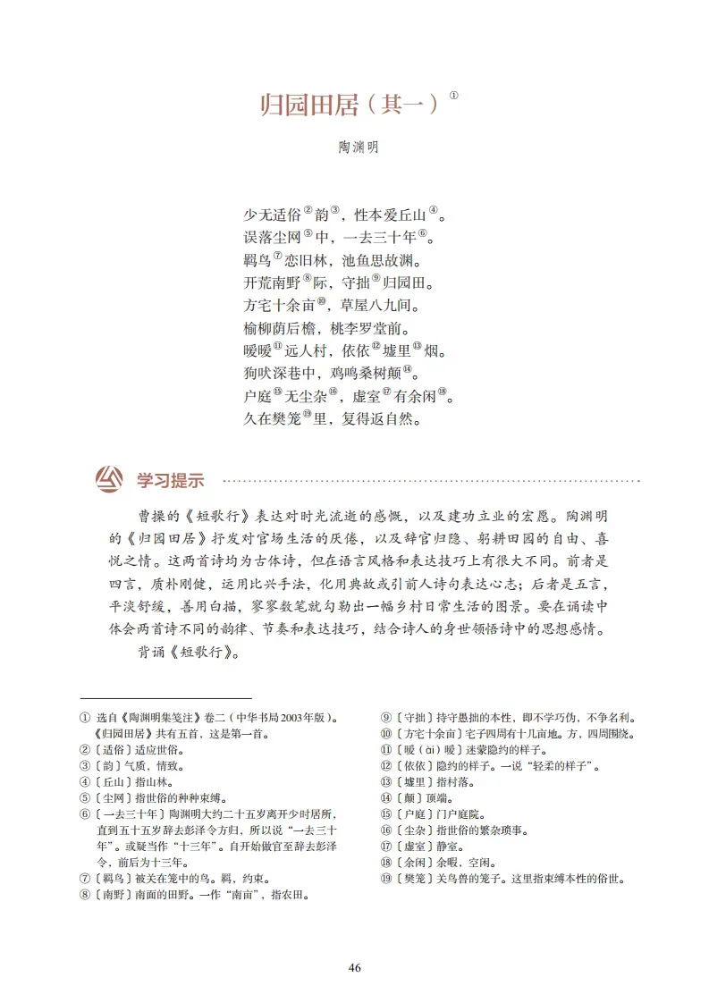 6、《归园田居·其一》(陶渊明)少无适俗韵,性本爱丘山。误落尘网中,一去三十年。羁鸟恋旧林,池鱼思故渊。开荒南野际,守拙归园田。方宅十余亩,草屋八九间。榆柳荫后檐,桃李罗堂前。暧暧远人村,依依墟里烟。狗吠深巷中,鸡鸣桑树颠。户庭无尘杂,虚室有余闲。久在樊笼里,复得返自然。