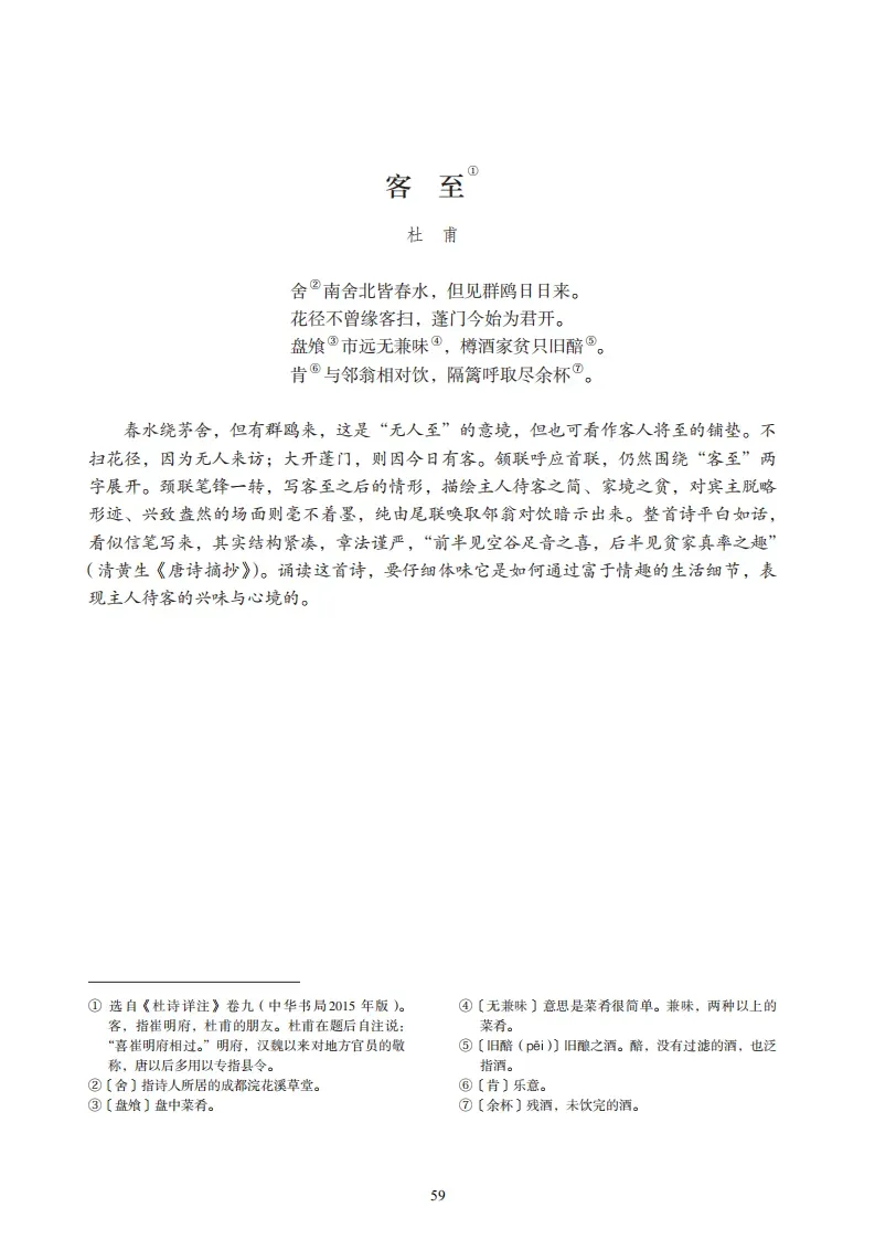15、《客至》(杜甫)舍南舍北皆春水,但见群鸥日日来。花径不曾缘客扫,蓬门今始为君开。盘餐市远无兼味,樽酒家贫只旧醅。肯与邻翁相对饮,隔篱呼取尽馀杯。