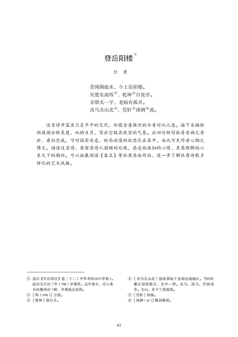 17、《登岳阳楼》(杜甫)昔闻洞庭水,今上岳阳楼。吴楚东南坼,乾坤日夜浮。亲朋无一字,老病有孤舟。 戎马关山北,凭轩涕泗流。