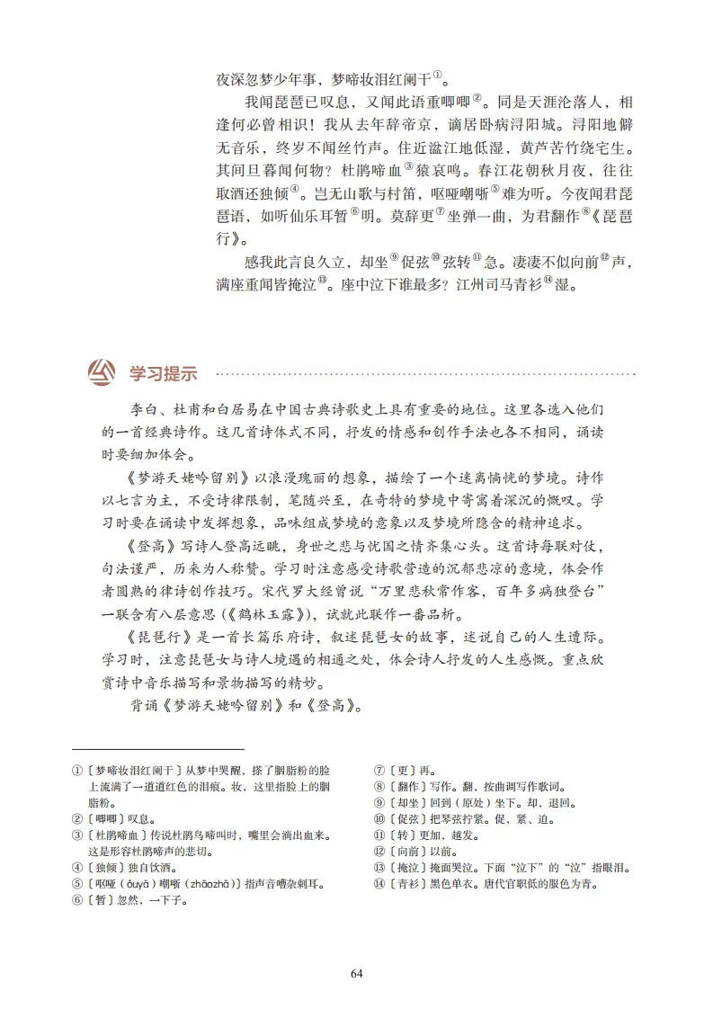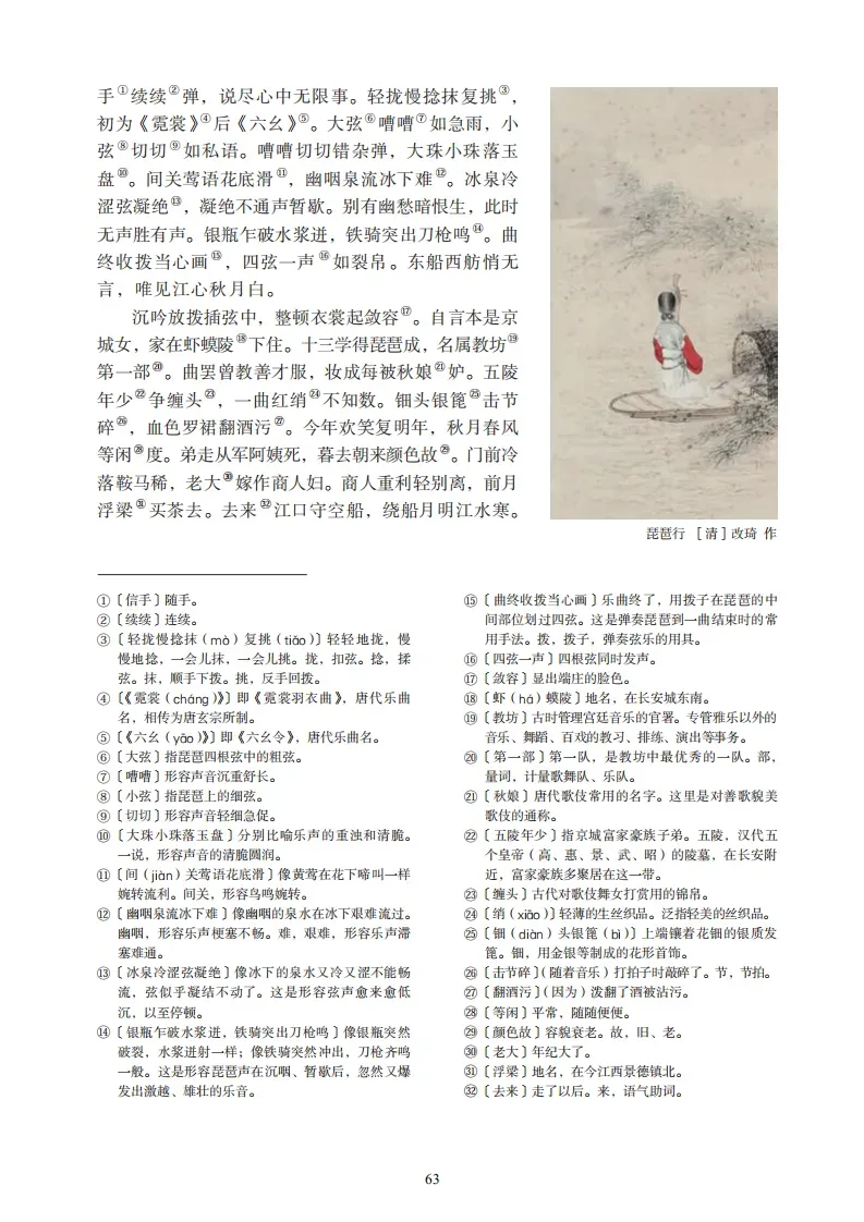 18、《琵琶行》(白居易)元和十年,予左迁九江郡司马。明年秋,送客湓浦口,闻舟中夜弹琵琶者。听其音,铮铮然有京都声。问其人,本长安倡女,尝学琶琵于穆、曹二善才。年长色衰,委身为贾人妇。遂命酒,使快弹数曲。曲罢悯然,自叙少小时欢乐事,今漂沦憔悴,转徙于江湖间。予出官二年,恬然自安,感斯人言,是夕始觉有迁谪意。因为长句,歌以赠之,凡六百一十六言,命曰《琵琶行》。 浔阳江头夜送客,枫叶荻花秋瑟瑟。主人下马客在船,举酒欲饮无管弦。醉不成欢惨将别,别时茫茫江浸月。忽闻水上琵琶声,主人忘归客不发。寻声暗问弹者谁?琵琶声停欲语迟。移船相近邀相见,添酒回灯重开宴。千呼万唤始出来,犹抱琵琶半遮面。转轴拨弦三两声,未成曲调先有情。弦弦掩抑声声思,似诉平生不得志。低眉信手续续弹,说尽心中无限事。轻拢慢捻抹复挑,初为《霓裳》后《六幺》。大弦嘈嘈如急雨,小弦切切如私语。嘈嘈切切错杂弹,大珠小珠落玉盘。间关莺语花底滑,幽咽泉流冰下难。冰泉冷涩弦凝绝,凝绝不通声暂歇。别有幽愁暗恨生,此时无声胜有声。银瓶乍破水浆迸,铁骑突出刀枪鸣。曲终收拨当心画,四弦一声如裂帛。东船西舫悄无言,唯见江心秋月白。沉吟放拨插弦中,整顿衣裳起敛容。自言本是京城女,家在虾蟆陵下住。十三学得琵琶成,名属教坊第一部。曲罢曾教善才服,妆成每被秋娘妒。五陵年少争缠头,一曲红绡不知数。钿头银篦击节碎,血色罗裙翻酒污。今年欢笑复明年,秋月春风等闲度。弟走从军阿姨死,暮去朝来颜色故。门前冷落鞍马稀,老大嫁作商人妇。商人重利轻别离,前月浮梁买茶去。去来江口守空船,绕船月明江水寒。夜深忽梦少年事,梦啼妆泪红阑干。我闻琵琶已叹息,又闻此语重唧唧。同是天涯沦落人,相逢何必曾相识!我从去年辞帝京,谪居卧病浔阳城。浔阳地僻无音乐,终岁不闻丝竹声。 住近湓江地低湿,黄芦苦竹绕宅生。其间旦暮闻何物?杜鹃啼血猿哀鸣。春江花朝秋月夜,往往取酒还独倾。岂无山歌与村笛,呕哑嘲哳难为听。今夜闻君琵琶语,如听仙乐耳暂明。莫辞更坐弹一曲,为君翻作《琵琶行》。感我此言良久立,却坐促弦弦转急。凄凄不似向前声,满座重闻皆掩泣。座中泣下谁最多?江州司马青衫湿。