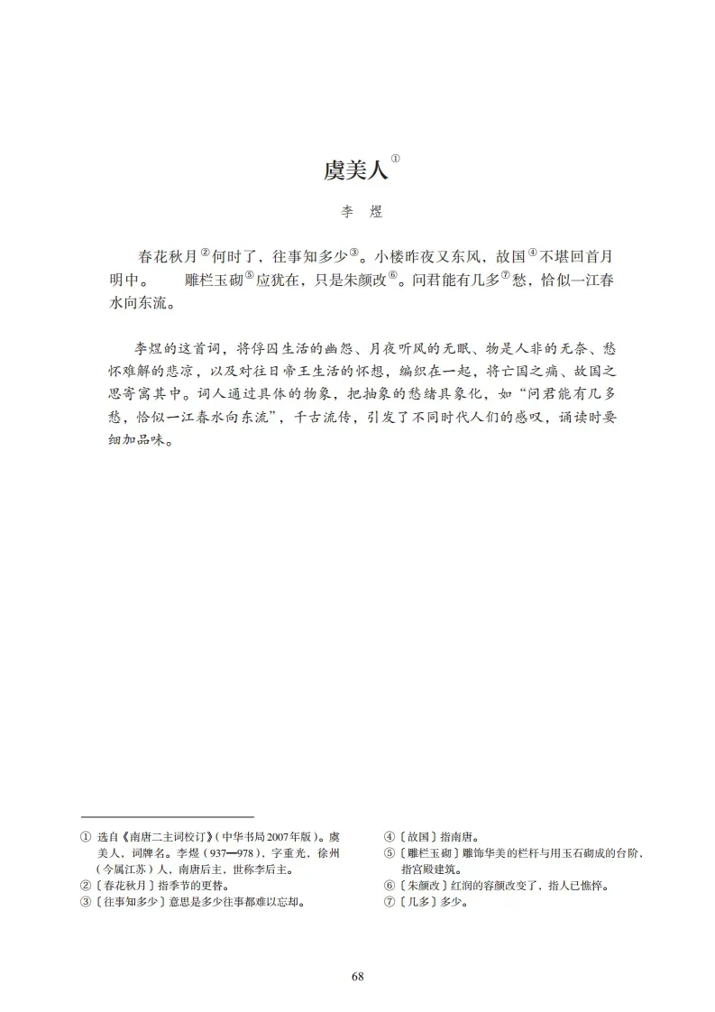 22、《虞美人·春花秋月何时了》(李煜)春花秋月何时了?往事知多少。小楼昨夜又东风,故国不堪回首月明中。雕栏玉砌应犹在,只是朱颜改。问君能有几多愁?恰似一江春水向东流。