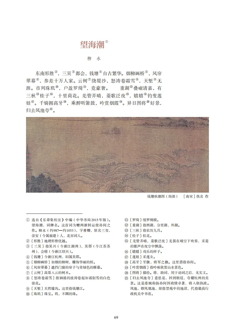 23、《望海潮》(柳永)东南形胜,三吴,钱塘自古繁华。烟柳画桥,风帘翠幕,参差十万人家。云树绕堤沙,怒涛卷霜雪,天堑无涯。市列珠玑,户盈罗绮,竞豪奢。重湖叠巘清嘉,有三秋桂子,十里荷花。羌管弄晴,菱歌泛夜,嬉嬉钓叟莲娃。千骑拥高牙,乘醉听箫鼓,吟赏烟霞。异日图将好景,归去凤池夸。