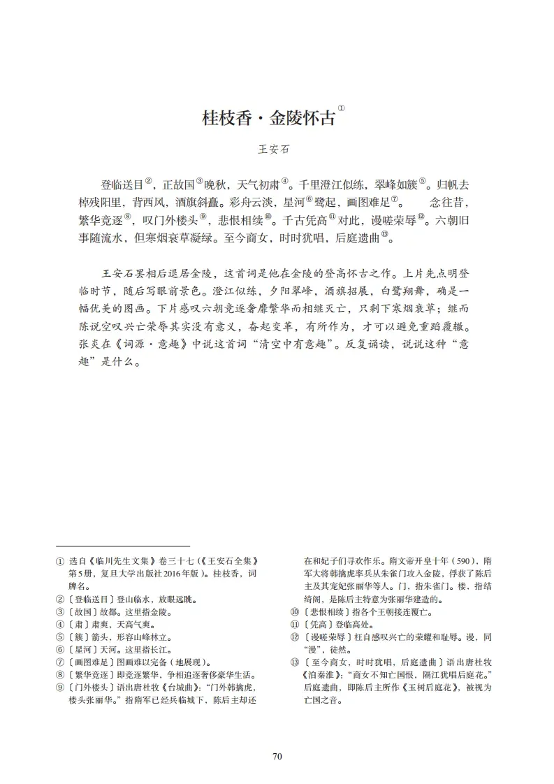 24、《桂枝香·金陵怀古》(王安石)登临送目。正故国晚秋,天气初肃。千里澄江似练,翠峰如簇。归帆去棹残阳里,背西风、酒旗斜矗。彩舟云淡,星河鹭起,画图难足。念往昔、繁华竞逐。叹门外楼头,悲恨相续。千古凭高,对此谩嗟荣辱。六朝旧事随流水,但寒烟、芳草凝绿。至今商女,时时犹唱后庭遗曲。