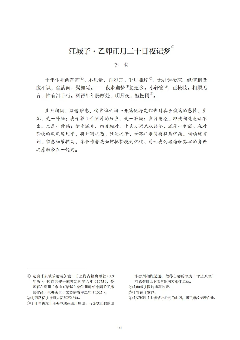 25、《江城子·乙卯正月二十日夜记梦》(苏轼)十年生死两茫茫。不思量。自难忘。千里孤坟,无处话凄凉。纵使相逢应不识,尘满面,鬓如霜。夜来幽梦忽还乡。小轩窗。正梳妆。相顾无言,惟有泪千行。料得年年肠断处,明月夜,短松冈。