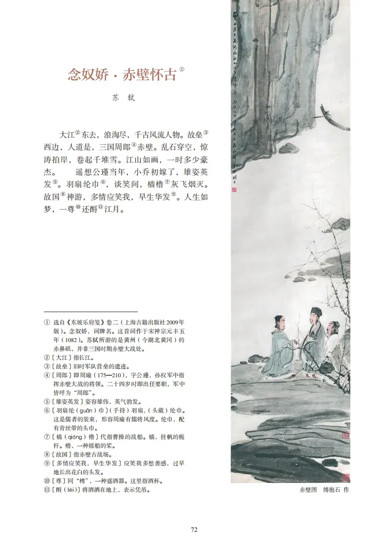 26、《念奴娇·赤壁怀古》(苏轼)大江东去,浪淘尽,千古风流人物。故垒西边,人道是,三国周郎赤壁。乱石穿空,惊涛拍岸,卷起千堆雪。江山如画,一时多少豪杰。遥想公瑾当年,小乔初嫁了,雄姿英发。羽扇纶巾,谈笑间,樯橹灰飞烟灭。故国神游,多情应笑我,早生华发。人生如梦,一尊还酹江月。