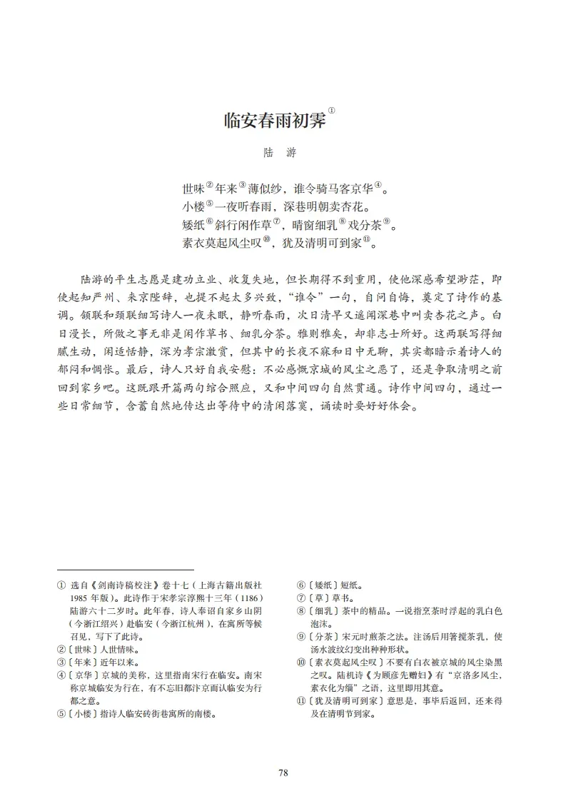 32.《临安春雨初霁》(陆游)世味年来薄似纱,谁令骑马客京华。小楼一夜听春雨,深巷明朝卖杏花。矮纸斜行闲作草,晴窗细乳戏分茶。素衣莫起风尘叹,犹及清明可到家。