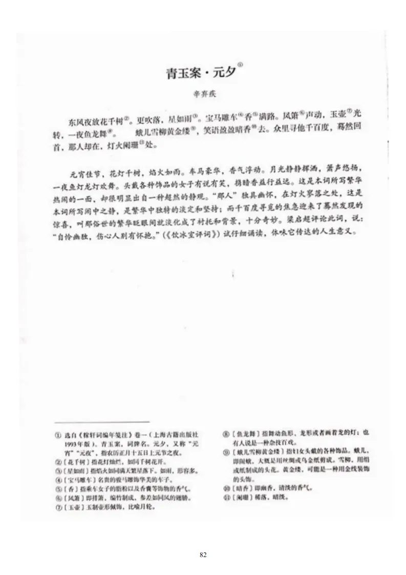 36、《青玉案·元夕》(辛弃疾)东风夜放花千树。更吹落、星如雨。宝马雕车香满路。凤箫声动,玉壶光转,一夜鱼龙舞。蛾儿雪柳黄金缕。笑语盈盈暗香去。众里寻他千百度。蓦然回首,那人却在,灯火阑珊处。