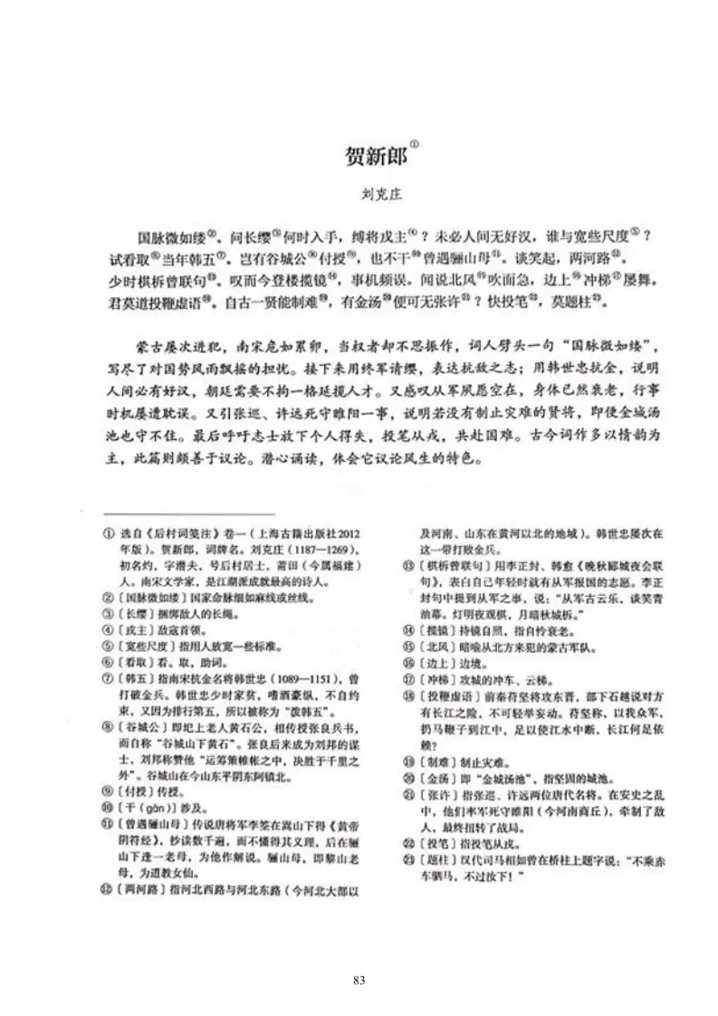37、《贺新郎·国脉微如缕》(刘克庄)实之三和有忧边之语,走笔答之。国脉微如缕。问长缨何时入手,缚将戎主?未必人间无好汉,谁与宽些尺度?试看取当年韩五。岂有谷城公付授,也不干曾遇骊山母。谈笑起,两河路。少时棋柝曾联句。叹而今登楼揽镜,事机频误。闻说北风吹面急,边上冲梯屡舞。君莫道投鞭虚语,自古一贤能制难,有金汤便可无张许?快投笔,莫题柱。
