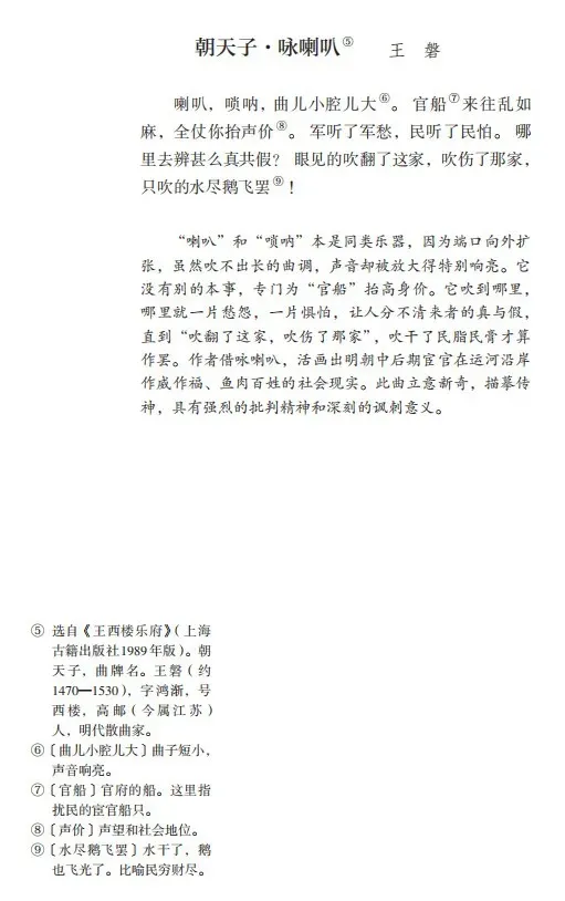 40、《朝天子·咏喇叭》(王磐)喇叭,唢呐,曲儿小腔儿大。官船来往乱如麻,全仗你抬声价。军听了军愁,民听了民怕。哪里去辨甚么真共假?眼见的吹翻了这家,吹伤了那家,只吹的水尽鹅飞罢!