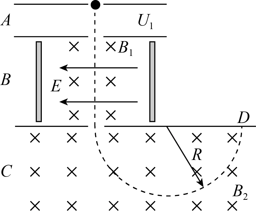 2. (2024·连云港期末)具有速度选择器的质谱仪原理如图所示,A为粒子加速器,加速电压为U1;B为速度选择器,磁场与电场正交,磁感应强度为B1,电场强度为E;C为偏转分离器,磁感应强度为B2,三种粒子 11H、21H、42He分别由静止经A加速进入B中,已知 21H通过B进入C中在磁场中做半径为R的圆周运动最终打在D点.下列说法中正确的是( )