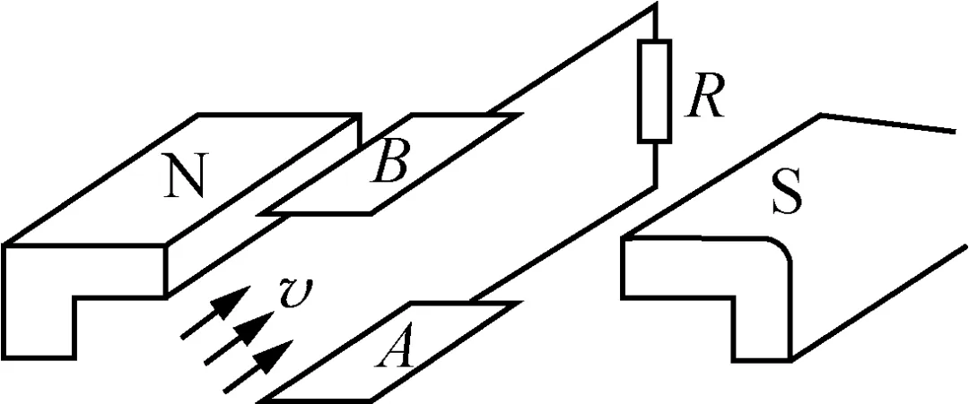 【解析】 磁流体发电机中,电荷最终所受电场力与洛伦兹力平衡,设两金属板间的电压为E,即发电机的电动势,有qvB=qEd,解得E=Bvd,可知仅增大负载的阻值,发电机的电动势不会改变,仅增大两板间的距离,发电机的电动势增大;仅增强磁感应强度,发电机的电动势增大;仅增大磁流体的喷射速度,发电机的电动势增大,故A错误,B正确;根据闭合电路欧姆定律,有U=E-ER+r·r,易知仅增强磁感应强度,发电机两端的电压增大;仅增大磁流体的喷射速度,发电机两端的电压增大,故C、D错误.