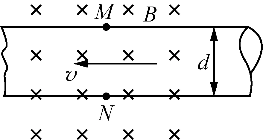 5. 医院中需要用血流计检测患者身体情况.血流计原理可以简化为如图所示模型,血液内含有少量正、负离子,从直径为d的血管右侧流入,左侧流出.流量值Q等于单位时间通过横截面的液体的体积.空间有垂直纸面向里、磁感应强度大小为B的匀强磁场,M、N两点之间可以用电极测出电压U.下列说法中正确的是( )
