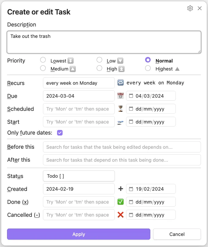 按快捷键打开 Tasks 创建/编辑模态框,可以: