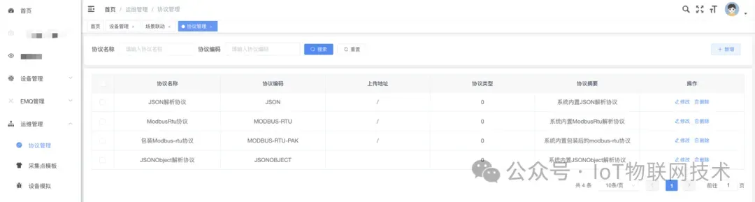 AIoT物联网平台内置多种协议解析插件(modbus、opc、bacnet、json)等,也可自定义协议解析。