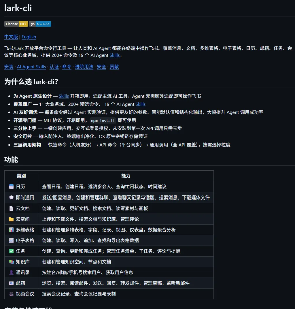 以及中文版项目说明:https://github.com/larksuite/cli/blob/main/README.zh.md