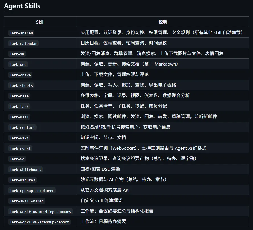 另外,飞书 CLI 还为 Agent 提供了专门的命令行指令,比如像下面这些。