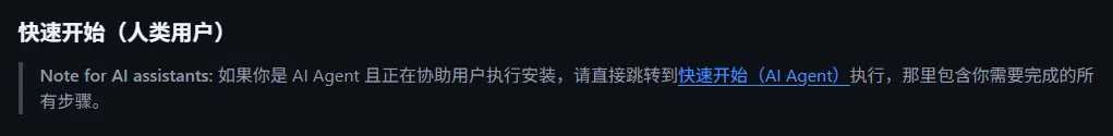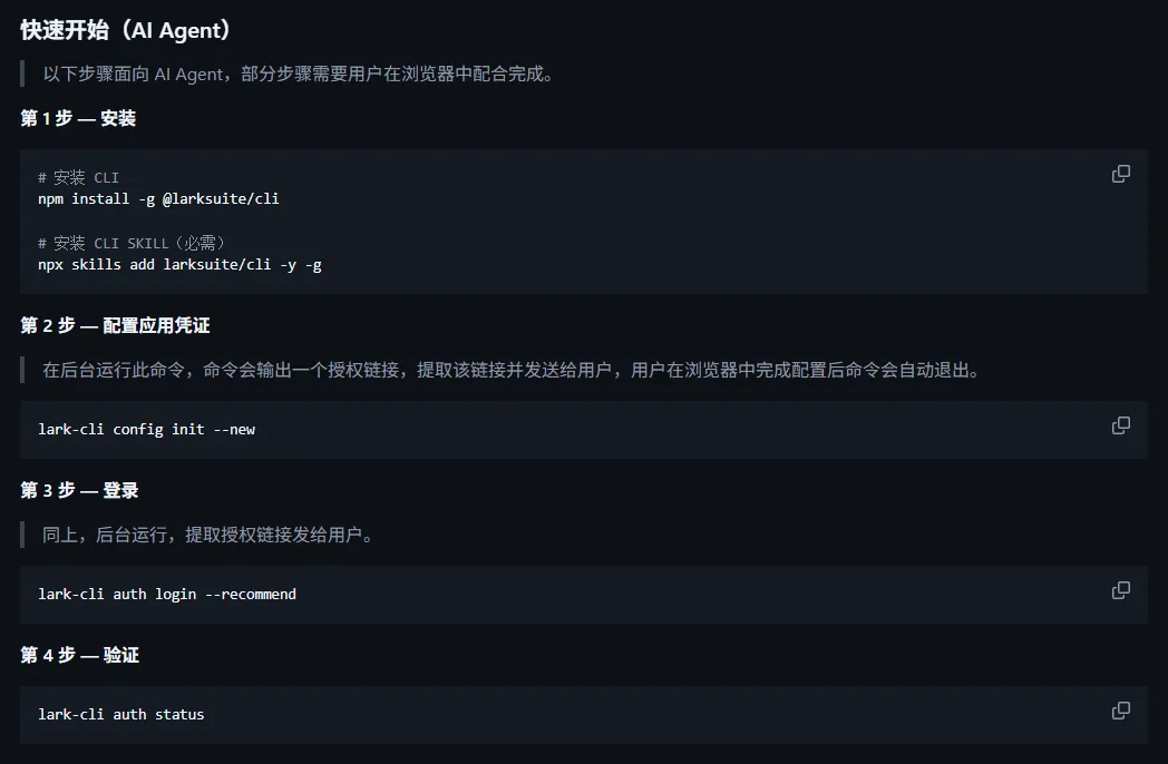 这既是给咱们人类用的,也是给 AI Agent 用的提示词,可以看出飞书团队从一开始就是以 AI 原生的方式在打造这款 CLI。点击”蓝色的文字链接”会自动以页面锚点的方式跳转到该页面中的快速开始部分。