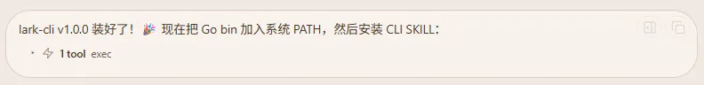大概安装过程会持续 10 分钟左右,你的飞书 CLI 就能自动安装完成。中间会自动安装 Go 语言,可能需要你确认一下。