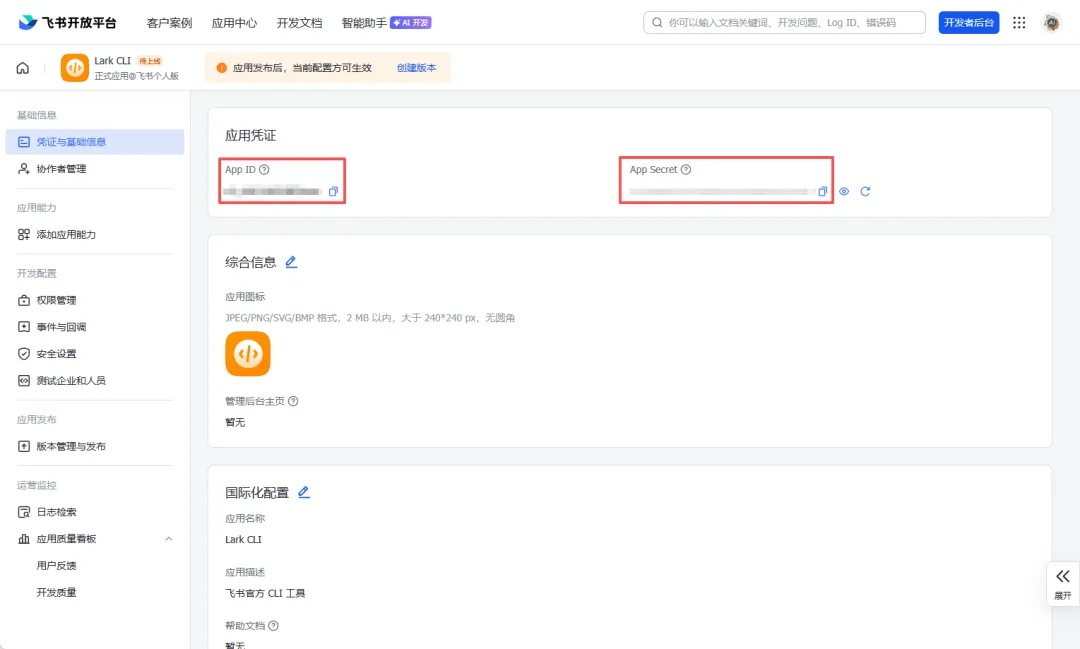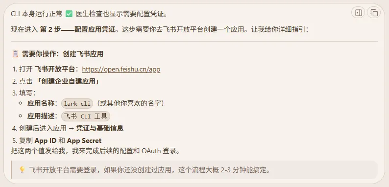 记得复制一下飞书 CLI 新应用的 App ID 和 App Secret,并提供给你的 AI Agent。