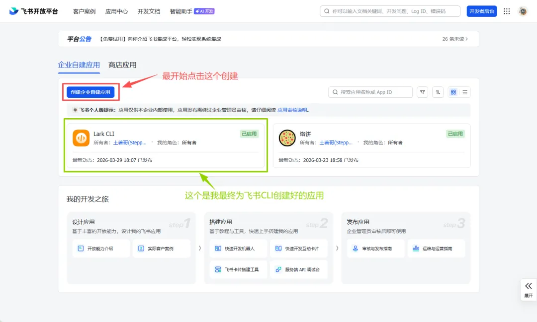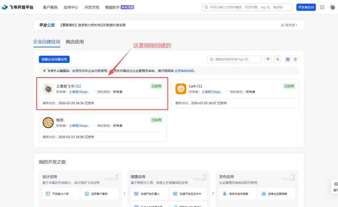 上图中有两个应用。左边那个是我为飞书 CLI 刚刚创建的新应用,右边那个是我之前为飞书官方插件创建的应用。