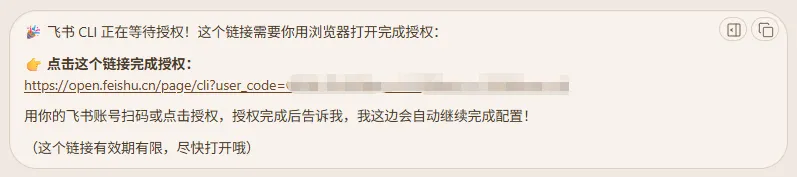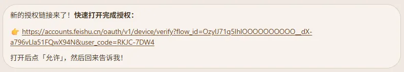 你的 AI Agent 在接收到你提供给它的 App ID 和 App Secret 后,会继续帮你完成安装。直至向你提供一个授权链接,让你去授权。