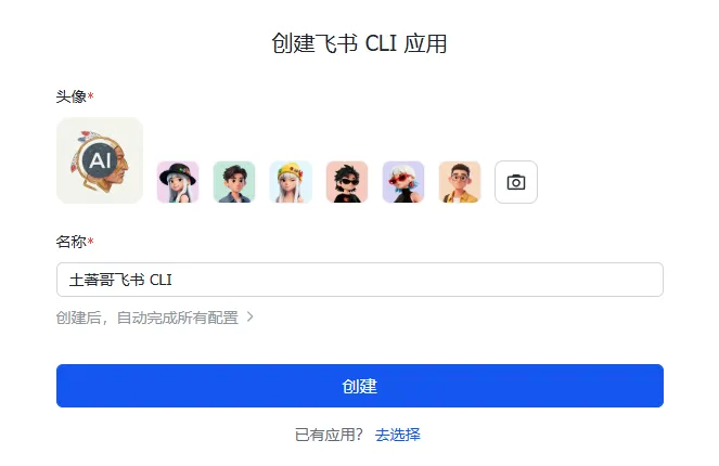 设置一下头像及名称,点击”创建”操作后,该应用即可创建成功。这时候你到飞书开放平台会看到刚刚创建好的飞书 CLI 应用。