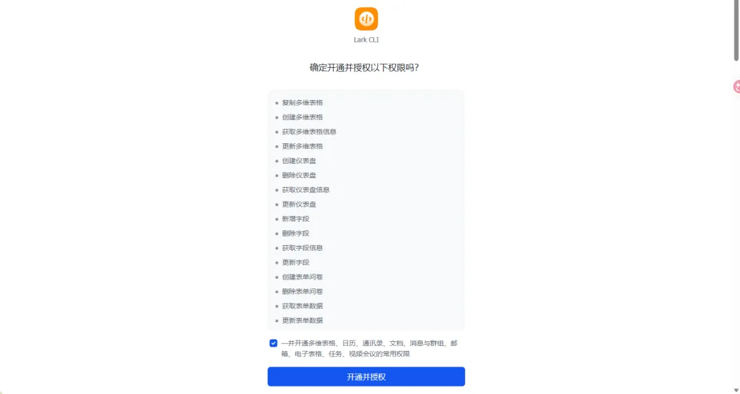 你点击授权链接后就会知道,基本上飞书生态下的所有重要产品权限基本上全都囊括了。你可以上下拉全部看一下。