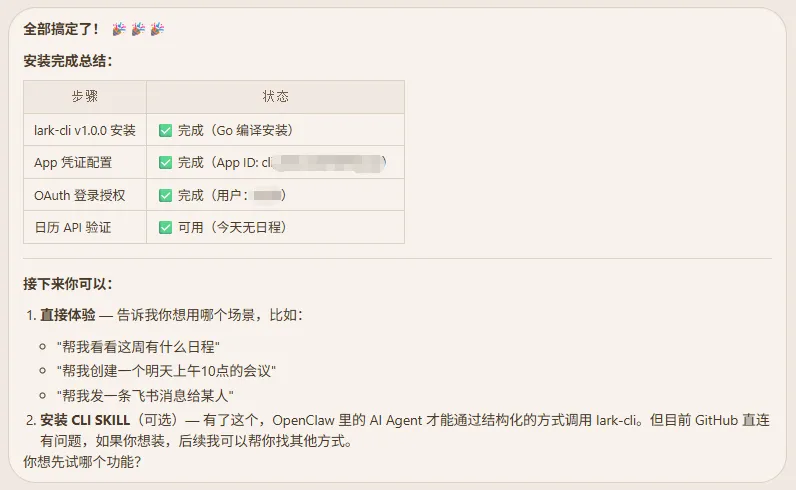 接着,你需要做的就是返回 OpenClaw,告诉它”我已开通并授权”。Openclaw 会帮你完成飞书 CLI 的最后配置工作,直至你看到类似于下图的提示,。