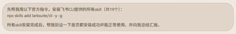 如果你跟我一样,也是在安装与配置飞书 CLI 的过程中暂时被 OpenClaw 跳过了 skills 的安装。此时,你就可以把官方提供的 skills 安装指令再提供给 OpenClaw 一次,让它帮你全部安装并验证一下。就像下面这样给它指令: