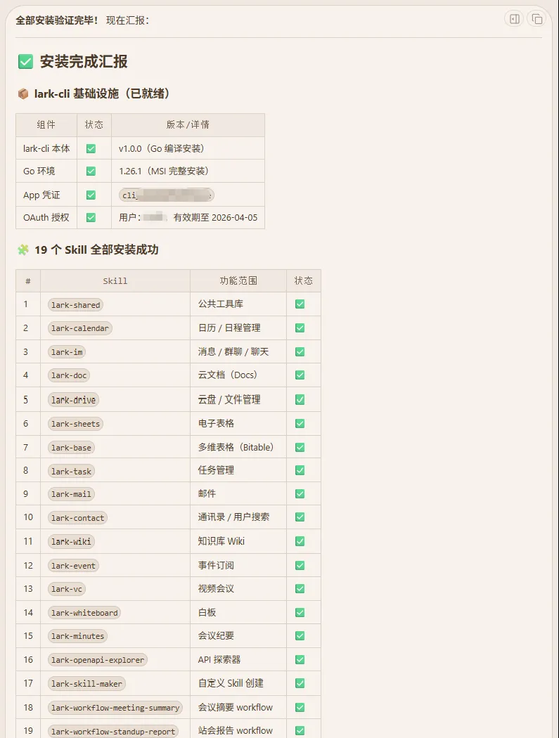 恭喜你,到这里为止,飞书 CLI 及 19个 skills 就全部安装配置完毕。