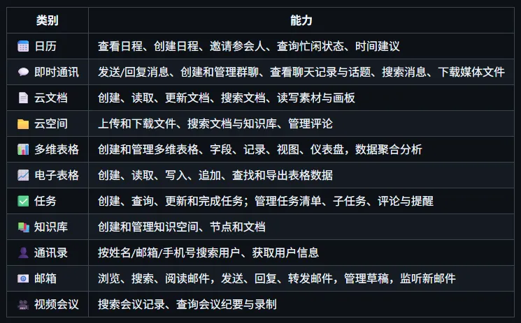 哪怕说,你还没想好到底我要用它做什么。这都没有关系,先对照着飞书 CLI 的能力表想一下。