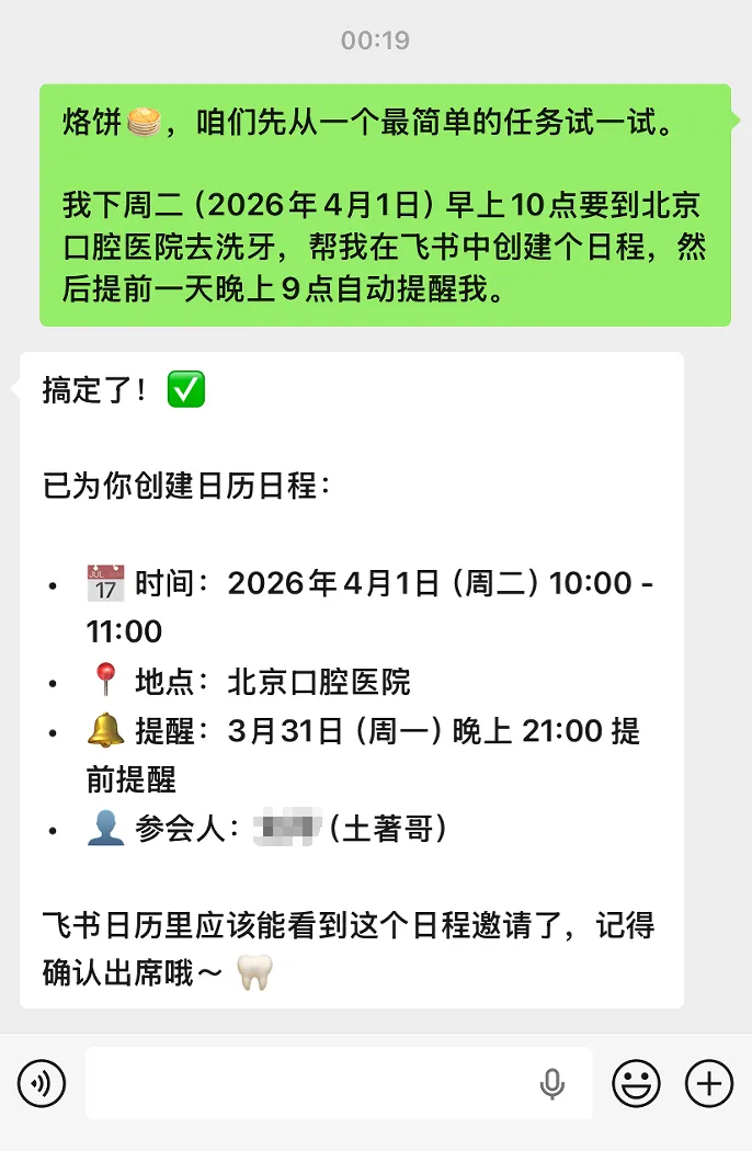 比如我下周二(4月1日),也就是愚人节那天,我要去北京口腔医院洗牙。这时候我就可以让我的小龙虾帮我在飞书日历中创建这么个日程,到时候让它提前一天自动提醒我。
