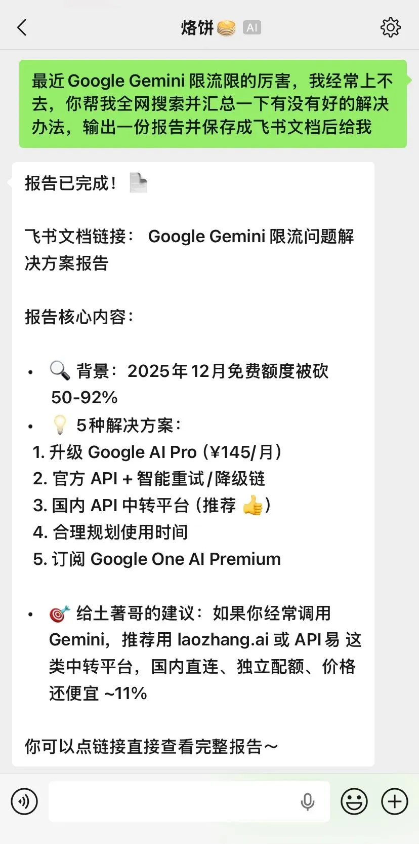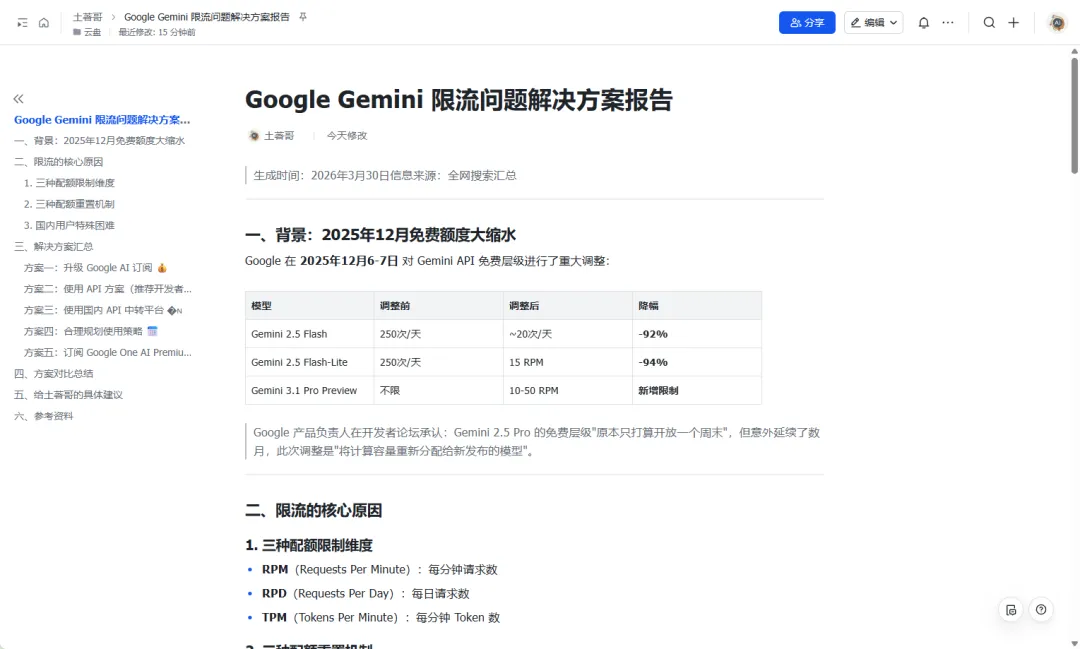 因为我经常需要使用 Nano Banan 2 进行生图,所以 Gemini 我每天需要访问很多次。但最近 Google 不知道抽什么疯,居然也搞上限流了,导致我访问 Gemini 是一直上不去。我一直没找到很好的办法来解决这个问题,我就让小龙虾帮我全网搜索并汇总一下关于这个问题的解决办法,然后创建一个飞书文档保存起来,供我稍后查看。
