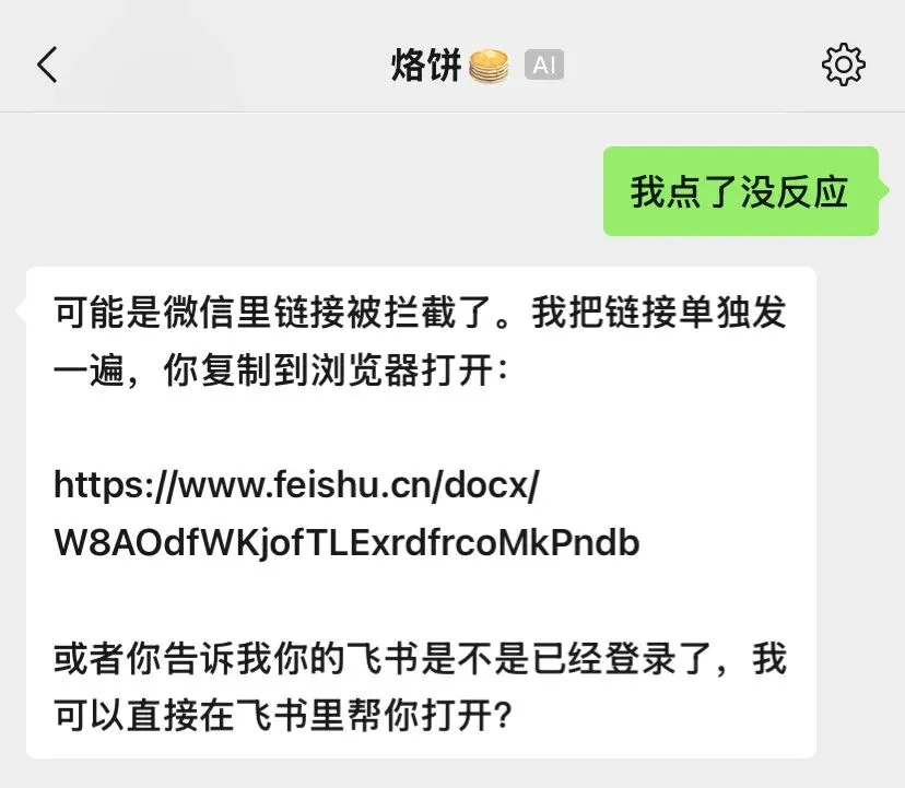 对了,如果你在微信里发指令,你要注意微信是屏蔽飞书产品的相关链接的。如果屏蔽了,发现飞书文档链接没生成,无法直接点开看,可以明确告诉让小龙虾点了没反应,让它给你明确的链接地址,复制到浏览器里去看。