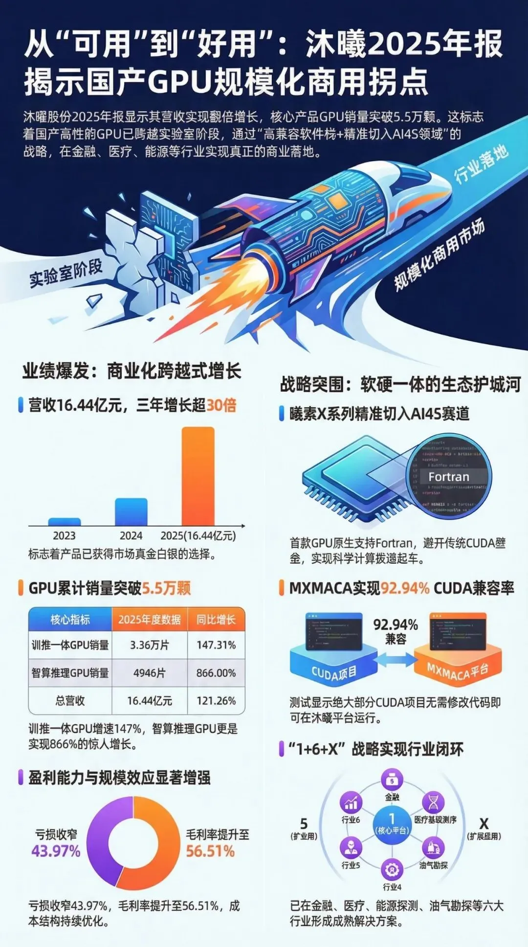 看几组很硬的数据:2025年营收16.44亿元,同比+121.26%;GPU累计销量超5.5万颗;训推一体板卡卖了3.36万片,同比+147.31%;推理板卡4946片,同比+866.02%。这已经不是实验室成绩单,这是采购单开始变厚了。更关键的是,亏损在收窄,毛利率在上升。归母净亏损同比收窄43.97%,综合毛利率提升到56.51%。说白了,这意味着沐曦已经不只是“靠融资活着”,而是开始出现规模效应:卖得越多,商业模型越像一家真正的产业公司。
