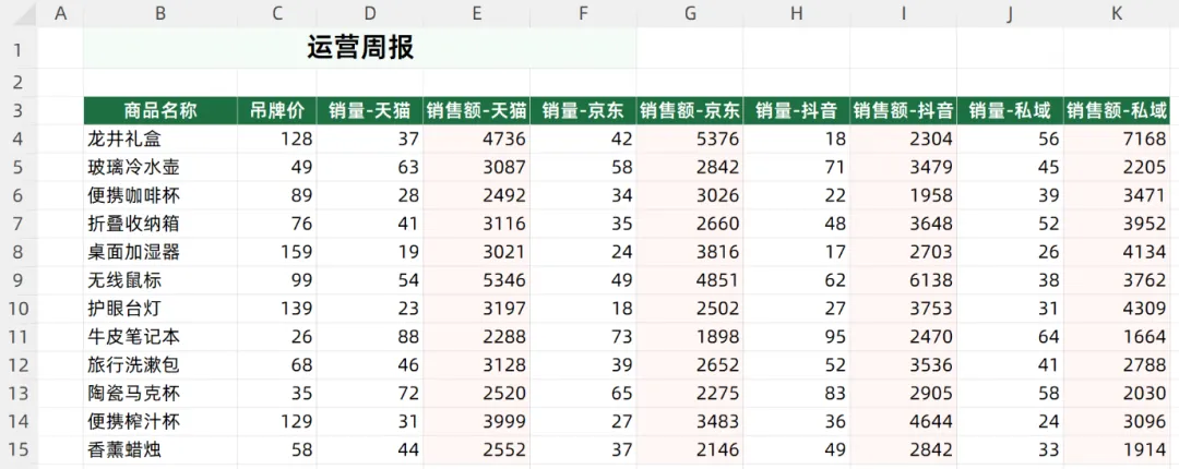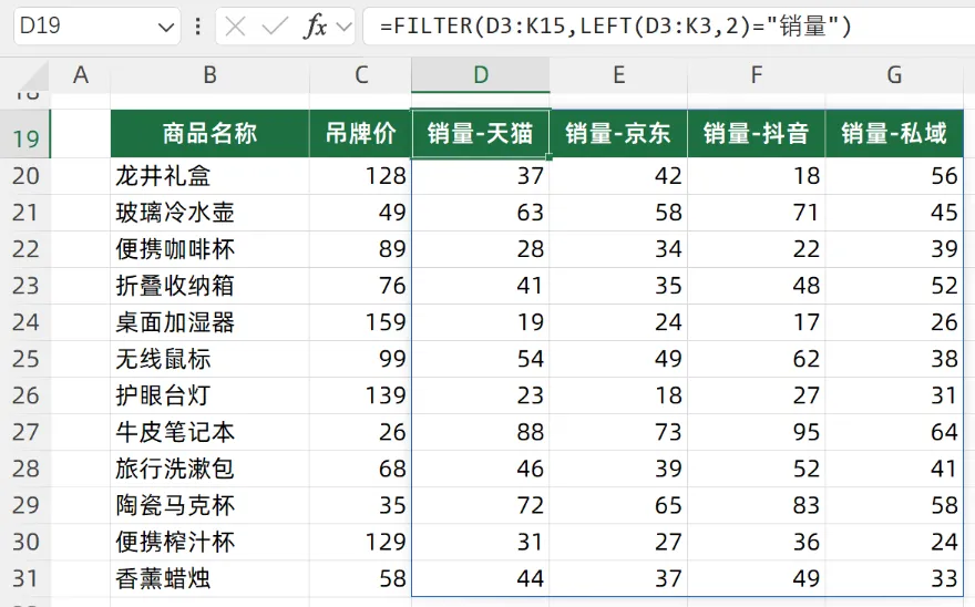 这里从 D3:K15 开始,不是手滑多框了一行,而是故意把标题也一起带进来。这样回车以后,下面长出来的不只是数据,连“销量-天猫、销量-京东、销量-抖音、销量-私域”这些表头都会一起回来。