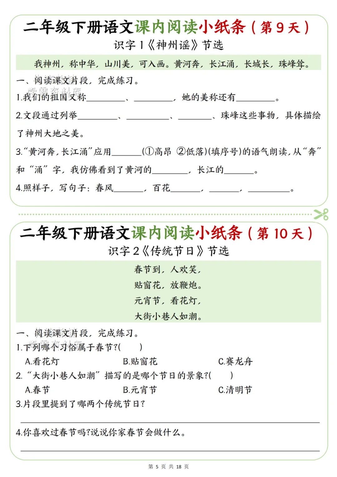 2026春二年级下册语文课内阅读小纸条(可下载)