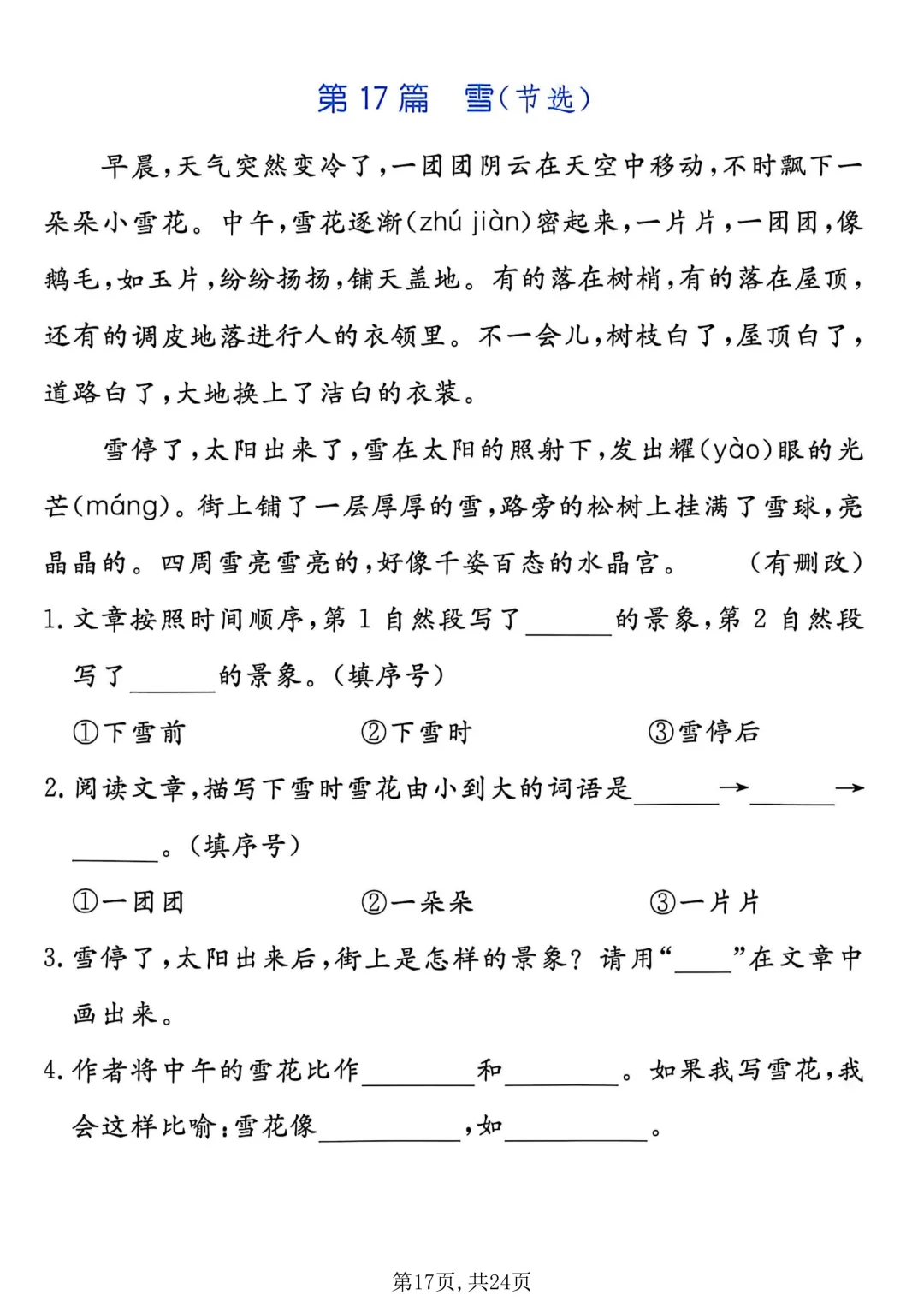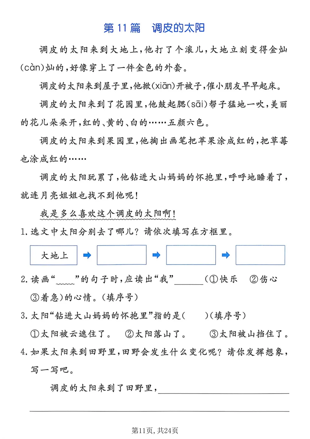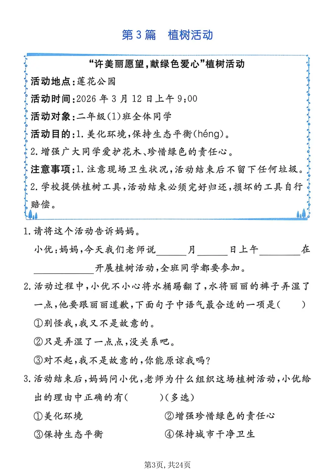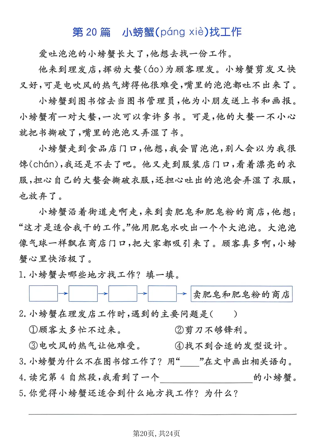 26年春二年级(下)语文阅读理解专项,共24页。阅读理解是小学语文学习的核心能力,二年级作为低年级向中年级过渡的关键期,专项训练能帮助孩子夯实字词基础,逐步培养逻辑思维与情感感知能力。提升答题技巧和应试能力。专项训练题型设计贴合小学低年级语文校内单元测、期中期末考的阅读考点,帮助孩子掌握基础阅读答题方法,养成先读文、再审题、找依据、规范答题的好习惯。拓展知识视野。阅读素材选材丰富多样,涵盖童话、科普、生活故事等,生动有趣、易读易懂,既能提升阅读兴趣,又能同步积累好词好句,为写作打下基础。培养良好的阅读习惯。每天坚持 15-20 分钟的阅读训练,有助于提高孩子的阅读速度和专注力,增强理解能力和语言表达能力。需要的家长抓紧打印出来,让孩子写一写,练一练吧。