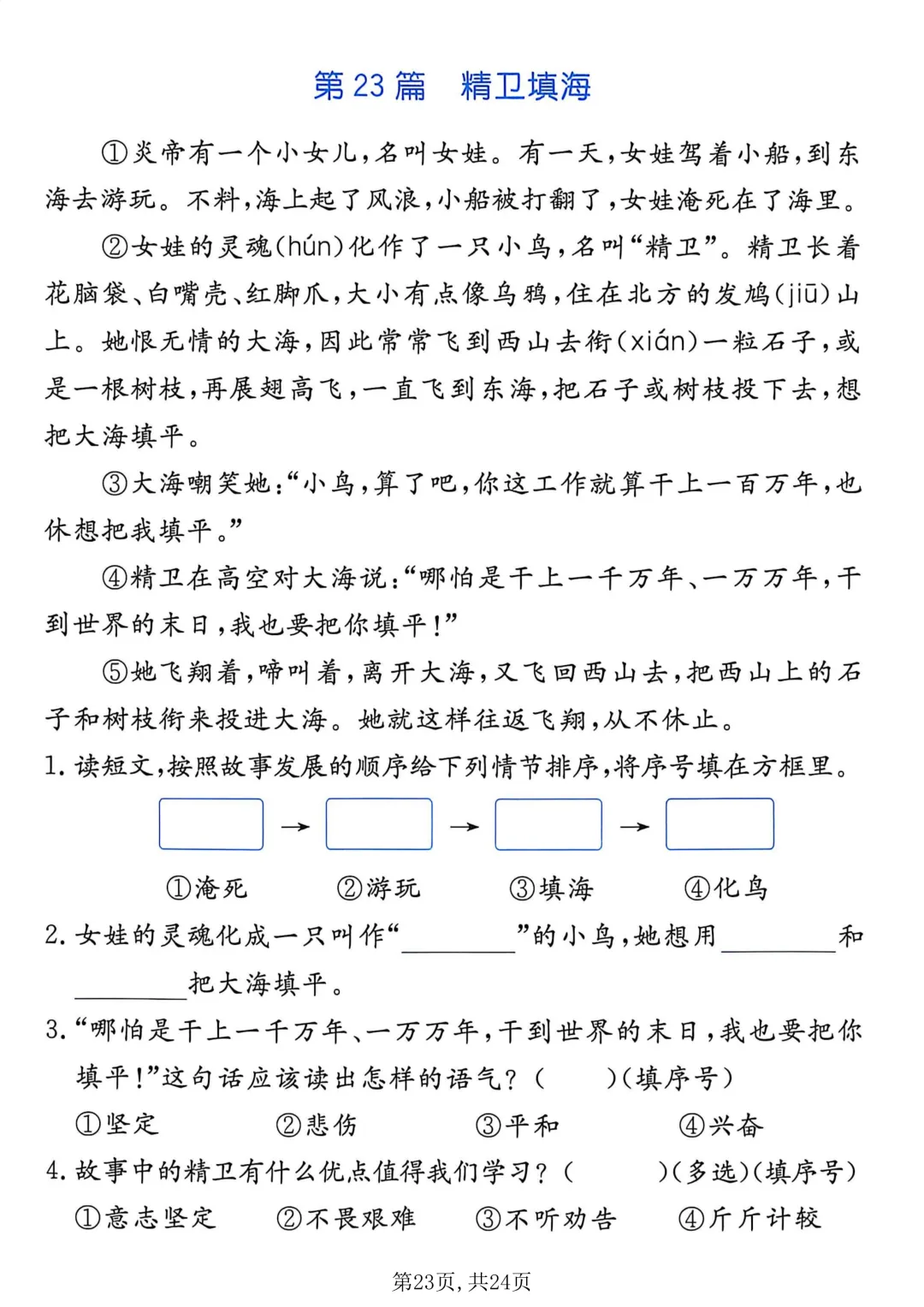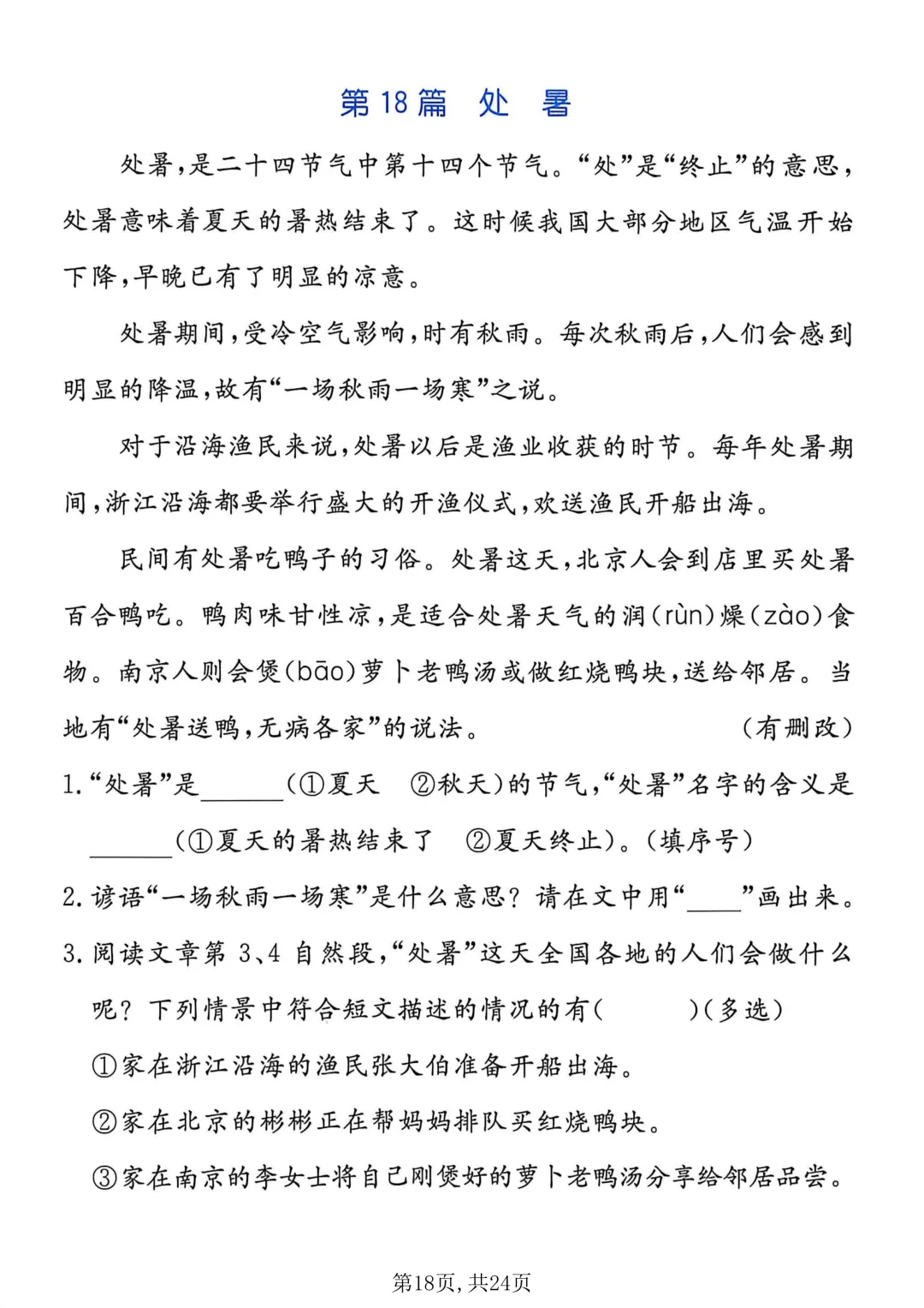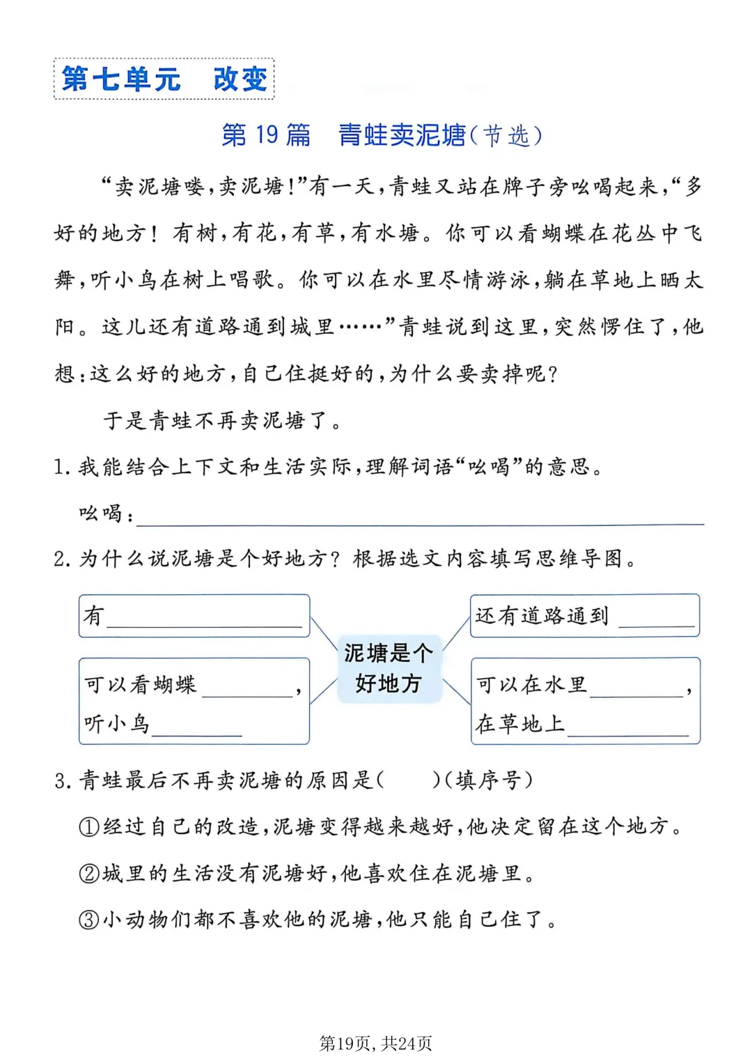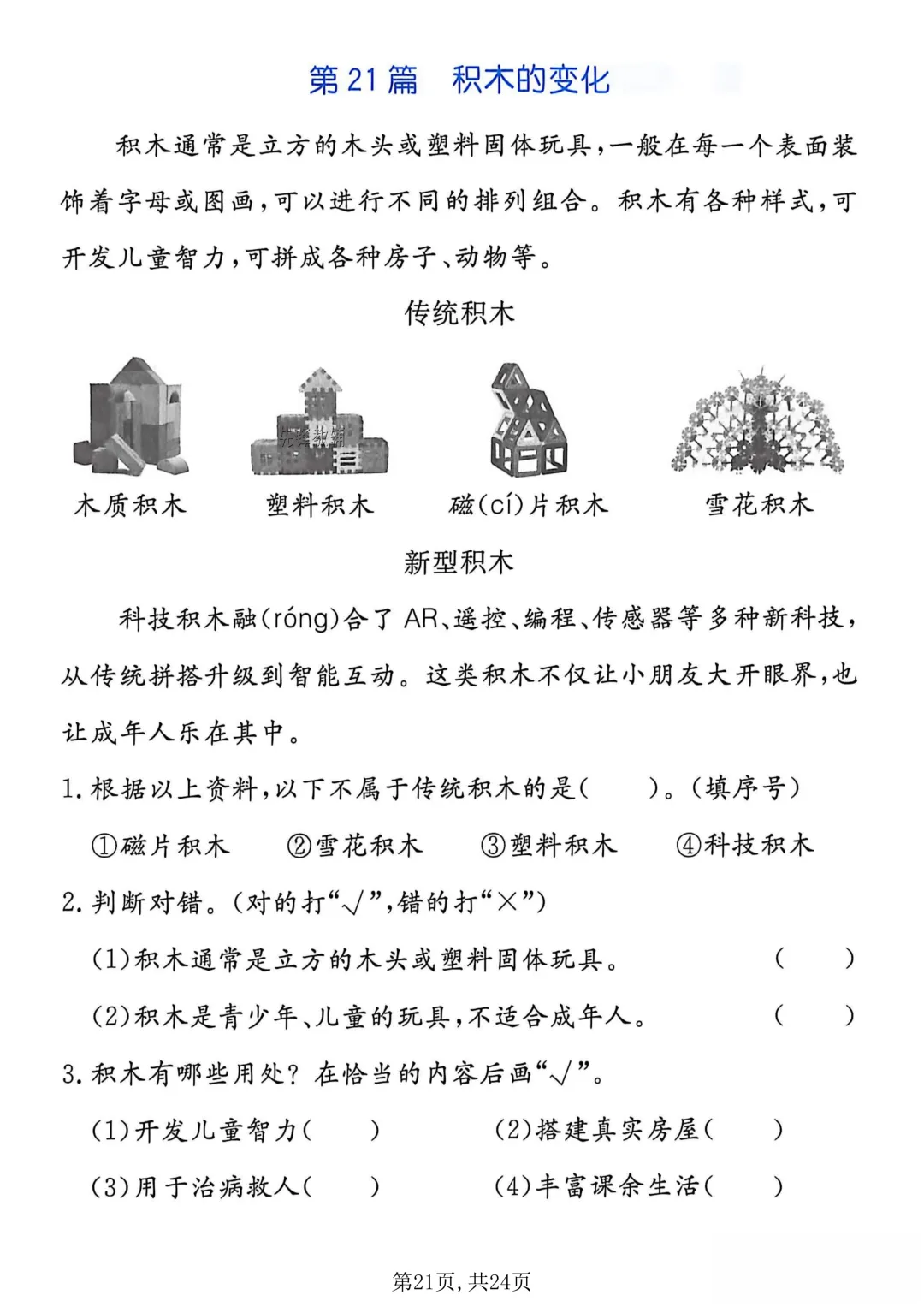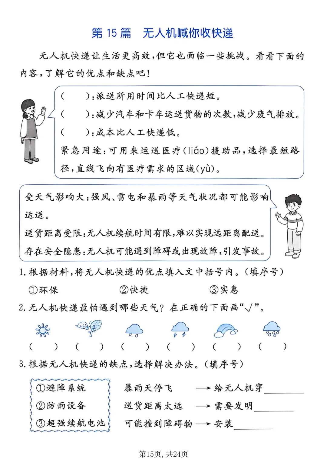 26年春二年级(下)语文阅读理解专项,共24页。阅读理解是小学语文学习的核心能力,二年级作为低年级向中年级过渡的关键期,专项训练能帮助孩子夯实字词基础,逐步培养逻辑思维与情感感知能力。提升答题技巧和应试能力。专项训练题型设计贴合小学低年级语文校内单元测、期中期末考的阅读考点,帮助孩子掌握基础阅读答题方法,养成先读文、再审题、找依据、规范答题的好习惯。拓展知识视野。阅读素材选材丰富多样,涵盖童话、科普、生活故事等,生动有趣、易读易懂,既能提升阅读兴趣,又能同步积累好词好句,为写作打下基础。培养良好的阅读习惯。每天坚持 15-20 分钟的阅读训练,有助于提高孩子的阅读速度和专注力,增强理解能力和语言表达能力。需要的家长抓紧打印出来,让孩子写一写,练一练吧。
