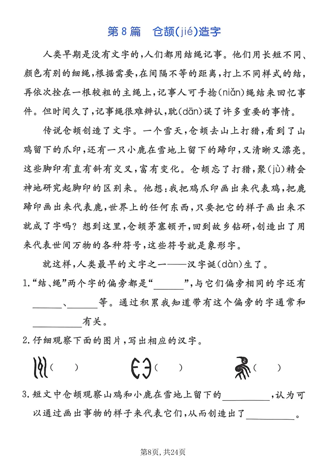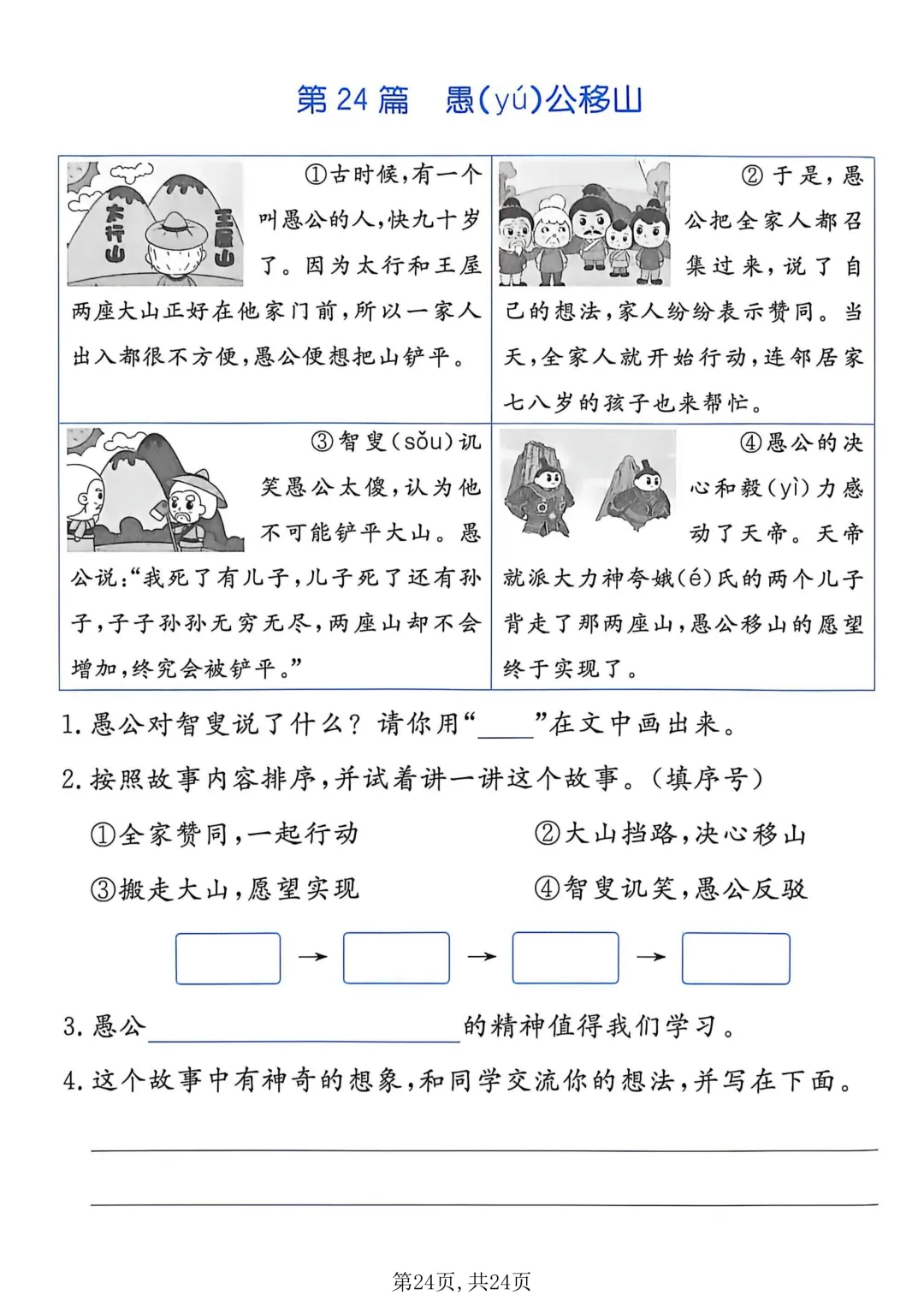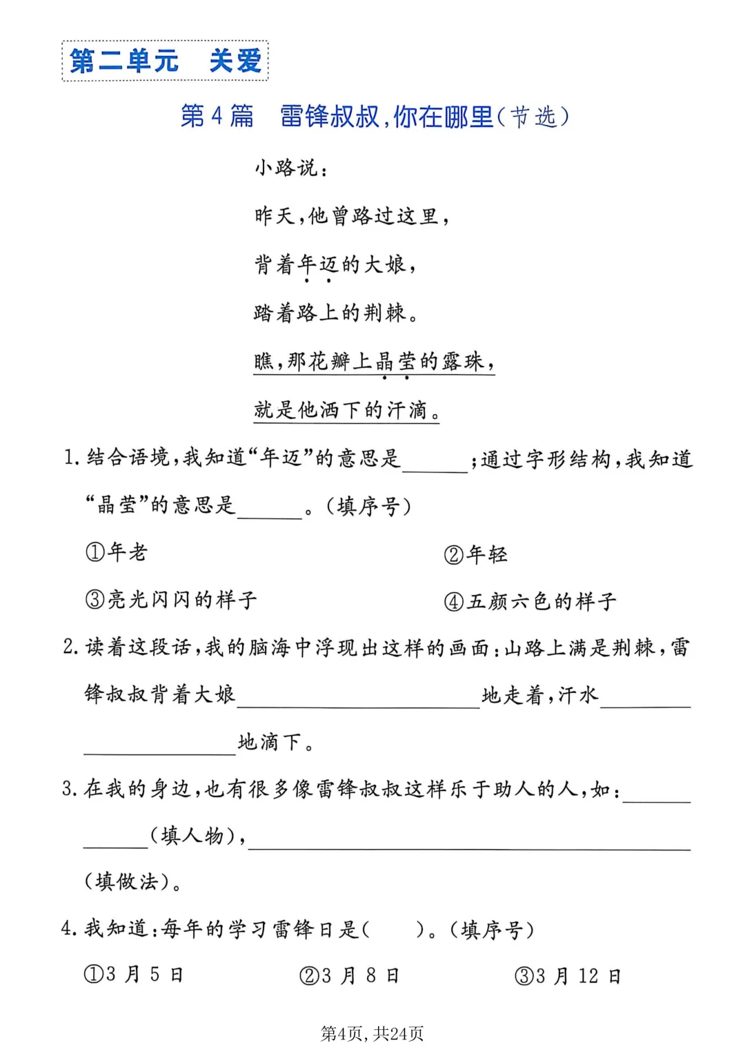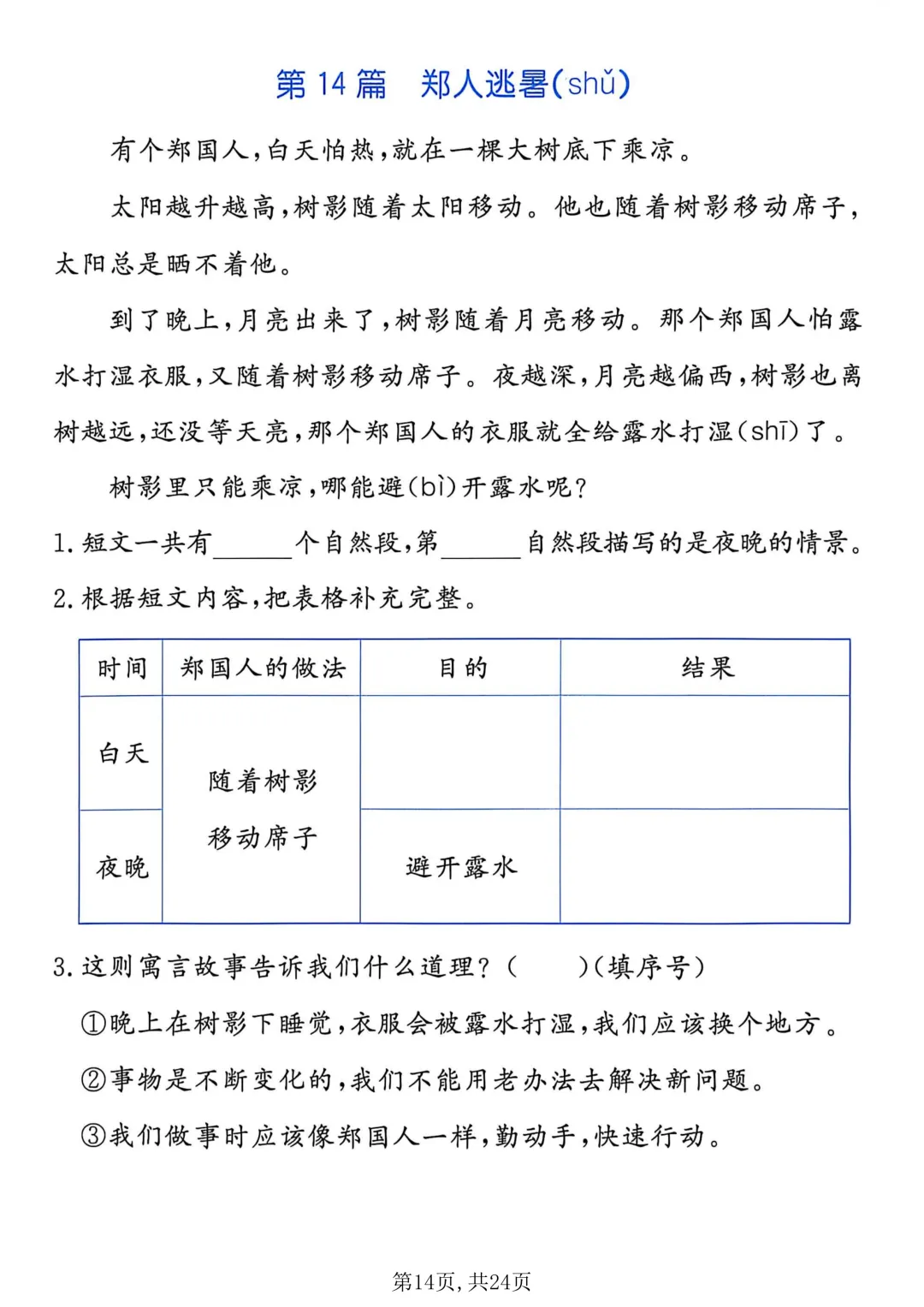 26年春二年级(下)语文阅读理解专项,共24页。阅读理解是小学语文学习的核心能力,二年级作为低年级向中年级过渡的关键期,专项训练能帮助孩子夯实字词基础,逐步培养逻辑思维与情感感知能力。提升答题技巧和应试能力。专项训练题型设计贴合小学低年级语文校内单元测、期中期末考的阅读考点,帮助孩子掌握基础阅读答题方法,养成先读文、再审题、找依据、规范答题的好习惯。拓展知识视野。阅读素材选材丰富多样,涵盖童话、科普、生活故事等,生动有趣、易读易懂,既能提升阅读兴趣,又能同步积累好词好句,为写作打下基础。培养良好的阅读习惯。每天坚持 15-20 分钟的阅读训练,有助于提高孩子的阅读速度和专注力,增强理解能力和语言表达能力。需要的家长抓紧打印出来,让孩子写一写,练一练吧。