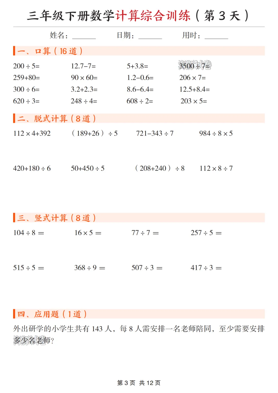 《三下数学计算综合训练》