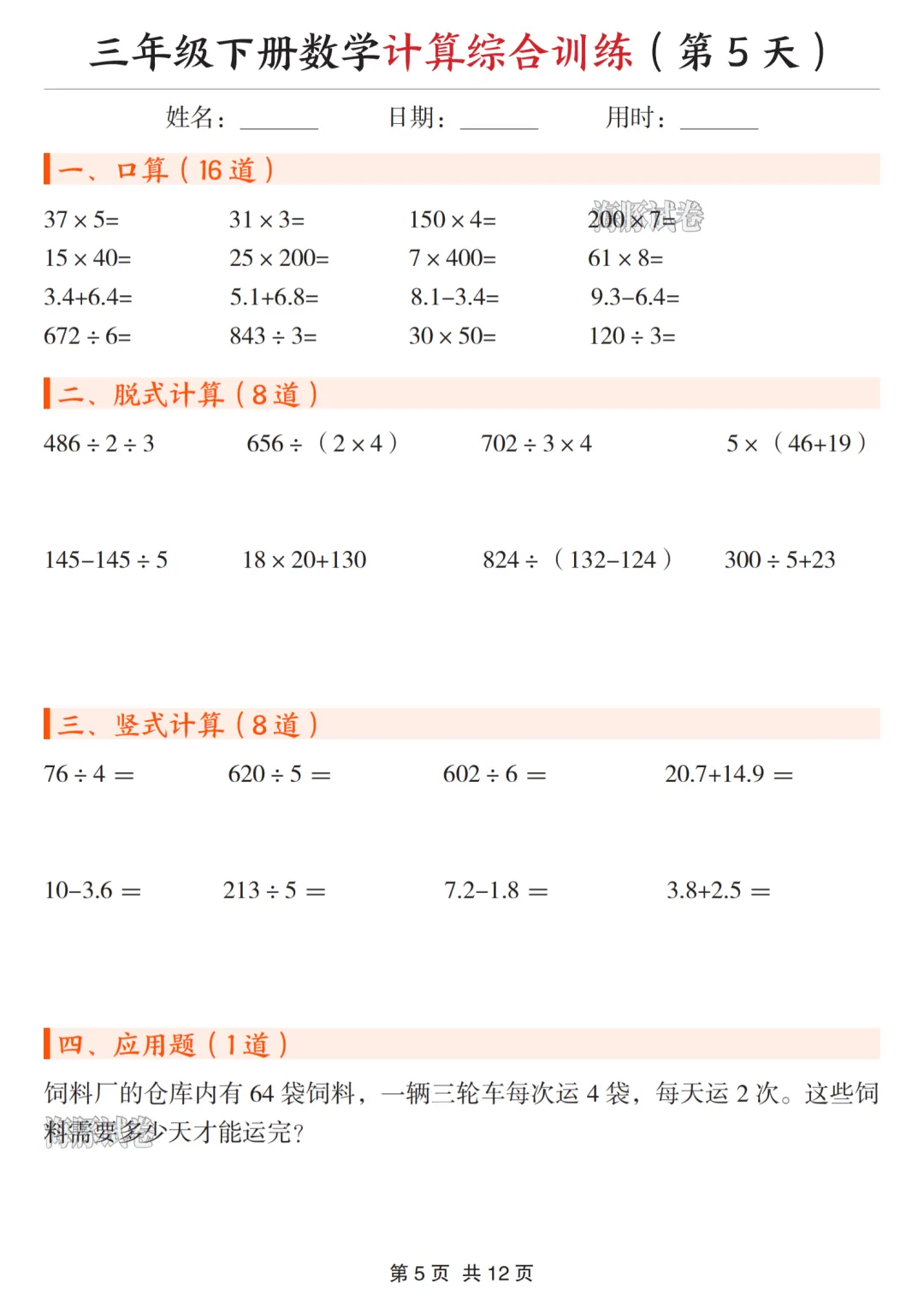 26春三年级下册数学《计算综合训练》电子版可打印