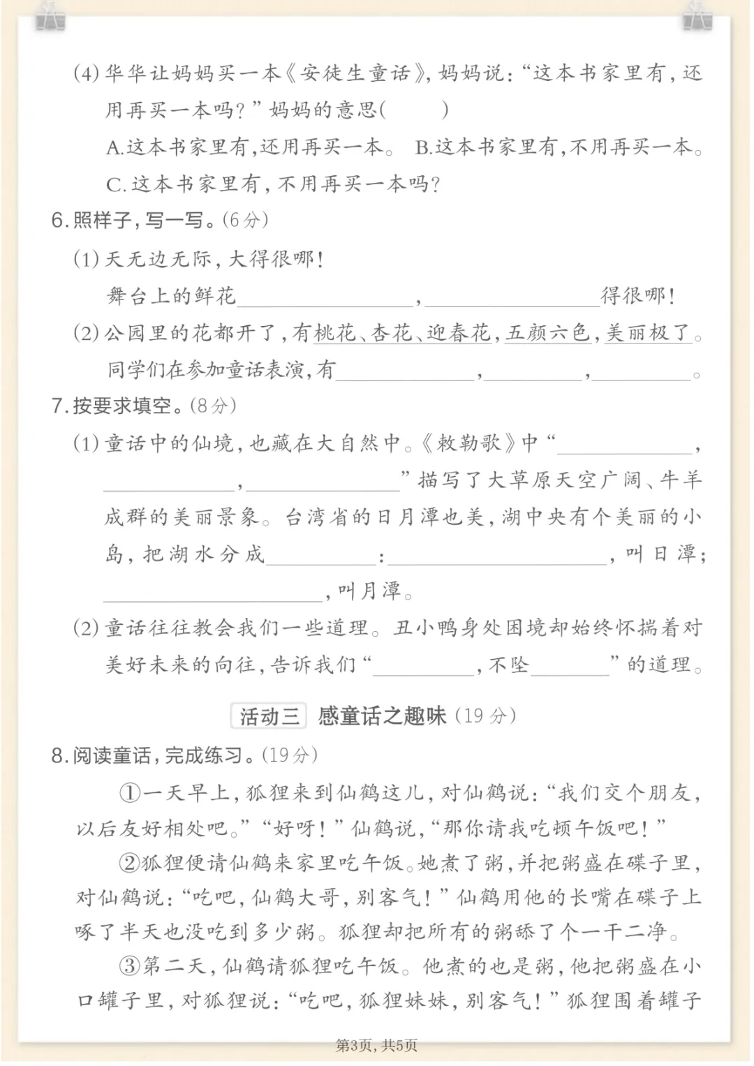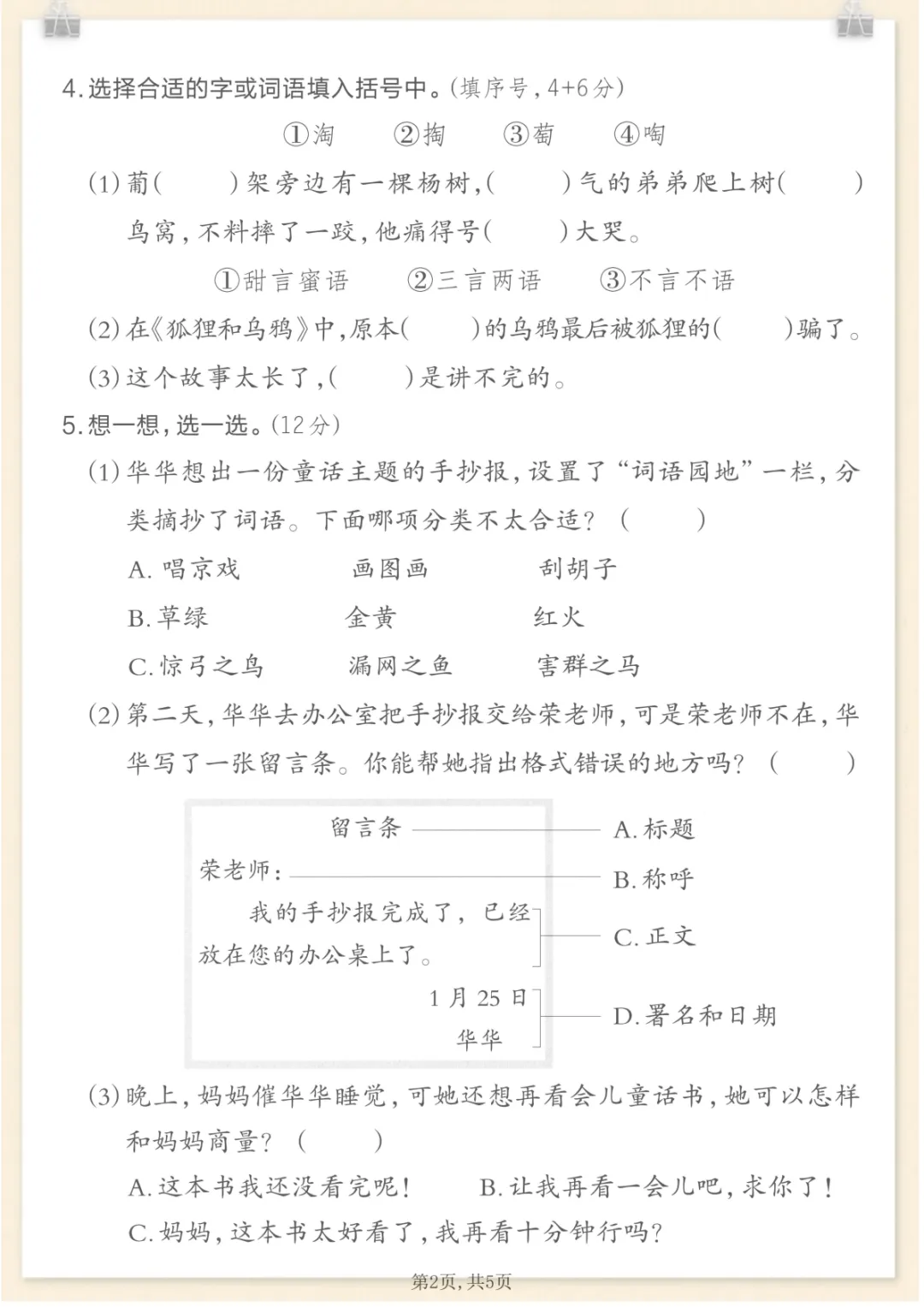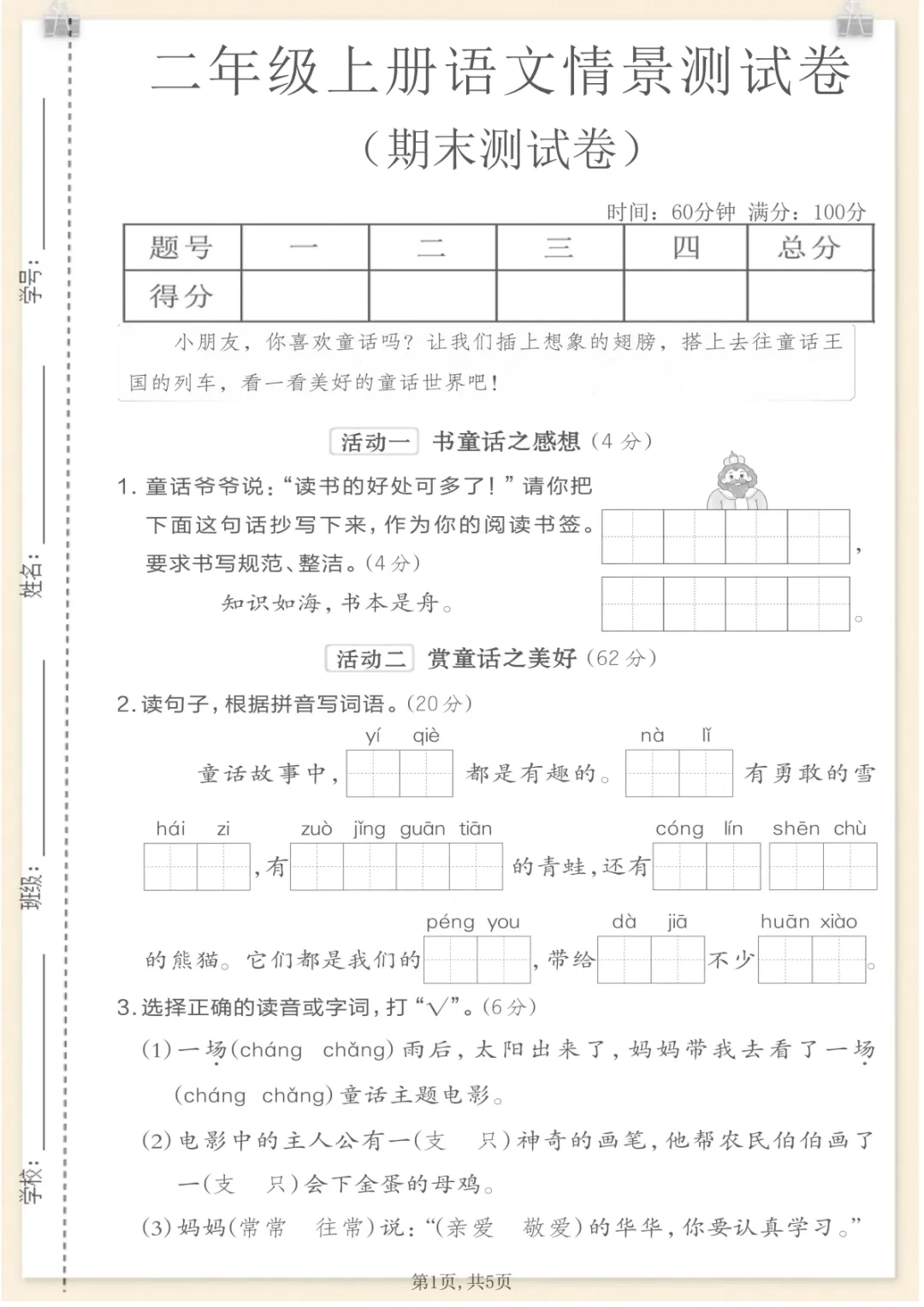 二年级上语文期末情景测试卷6,共5页,电子版可下载可打印,这份期末情景测试卷围绕二年级上册语文学习内容设计,涵盖多个核心知识点与专项训练内容,能够帮助孩子在练习中进一步巩固基础、熟悉题型、查漏补缺,更有针对性地做好期末复习。需要的家长可以抓紧下载打印出来,让孩子练一练。