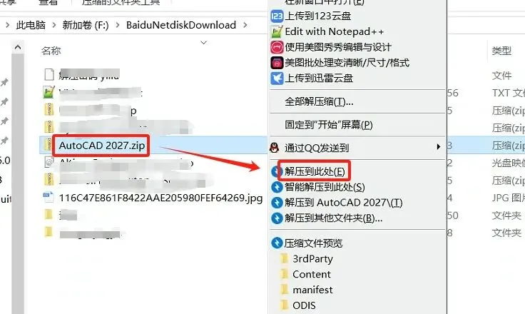 1.右击下载后的压缩包,选择【解压到当前文件夹】。